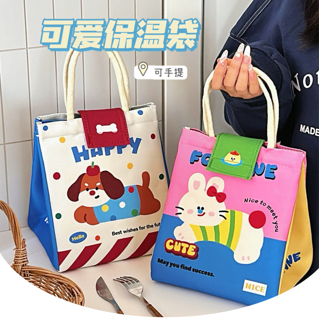 カジュアルでポップなデザインの保温ランチバッグをご紹介します。愛らしいキャラクターと元気の出るメッセージをあしらった2種類のデザインで、保温・保冷機能を備えた実用的なアイテムです。内部には一体型の保温アルミ膜を採用し、両側にはスナップボタンで容量を調節できる機能的な設計となっています。持ち手には丈夫なロープを使用し、マジックテープ式の開閉口で使いやすさも考慮されています。