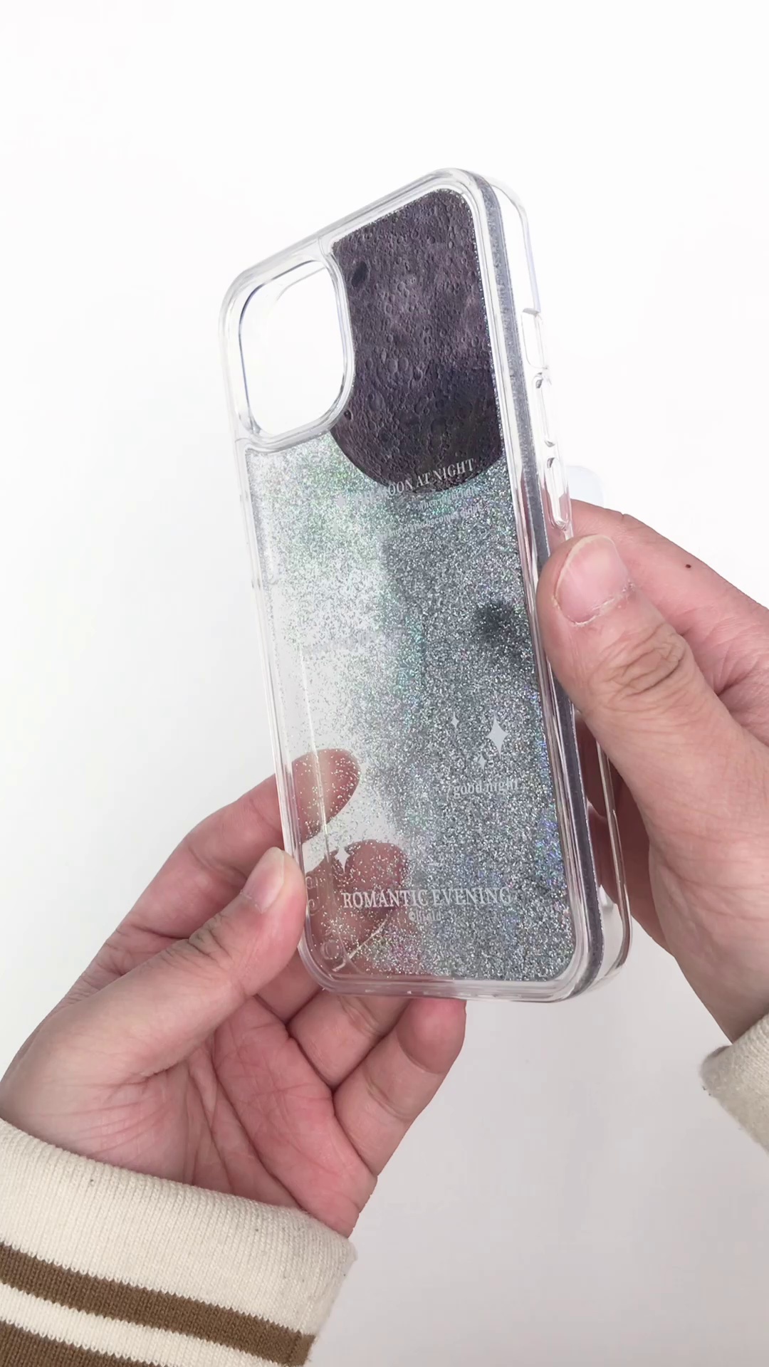 キラキラ液体流砂のiPhoneケース|右上に飾った月球模様は神秘感が溢れる