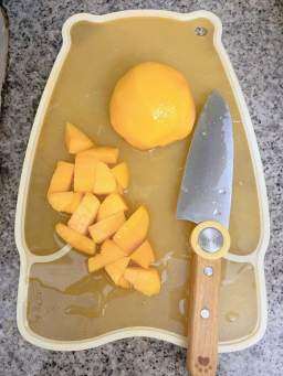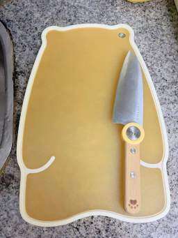 果物を切るために買ったが、果物ナイフと一緒に買ってきた。果物ナイフはとても鋭く、桃を切ると非常に滑らかだった。まな板は可愛いクマの形をしており、周りには滑り止めのゴムが付いていて、高くなっているため、水があってもテーブルに流れ出ることはない。果物を切るための専用の板で、他の匂いもしないので、とても気に入っています。