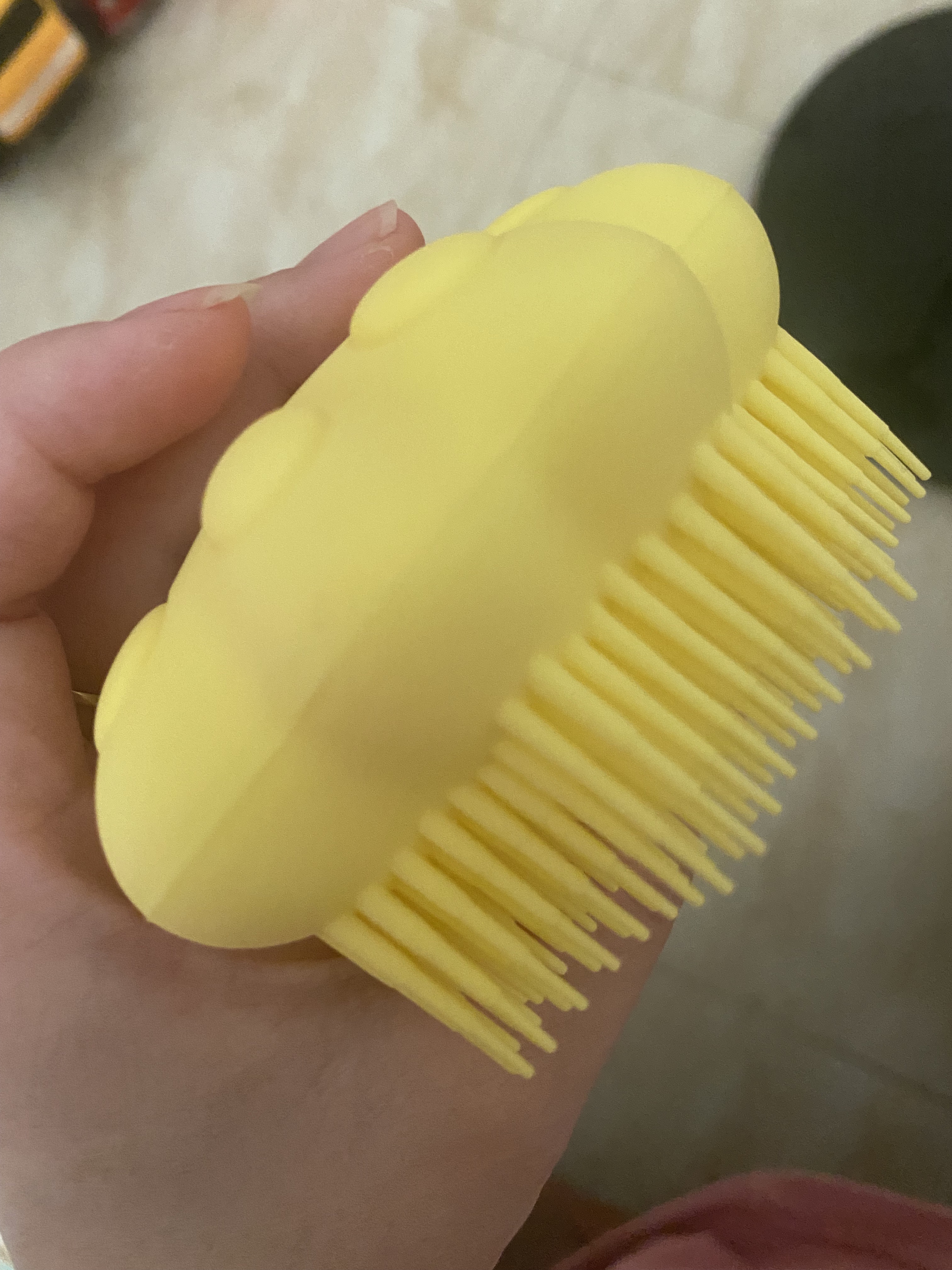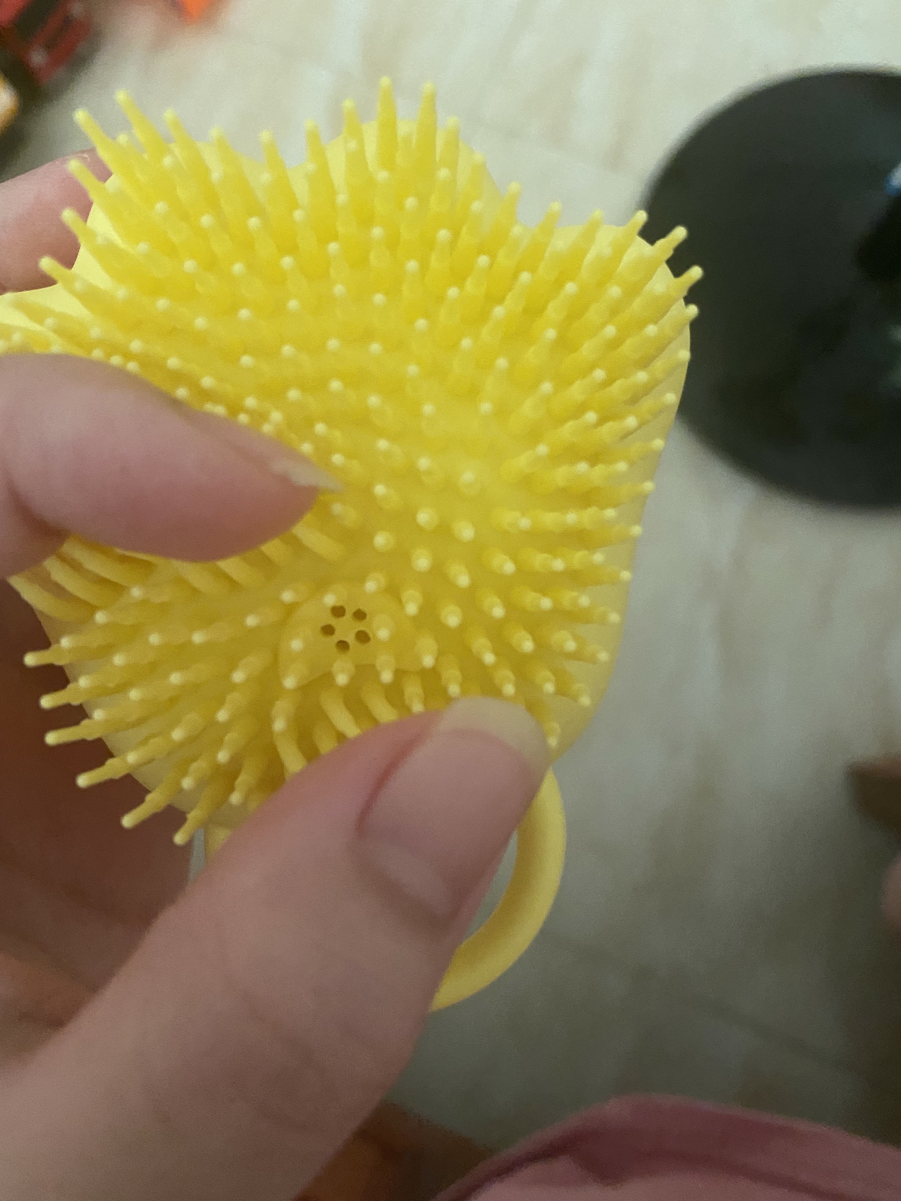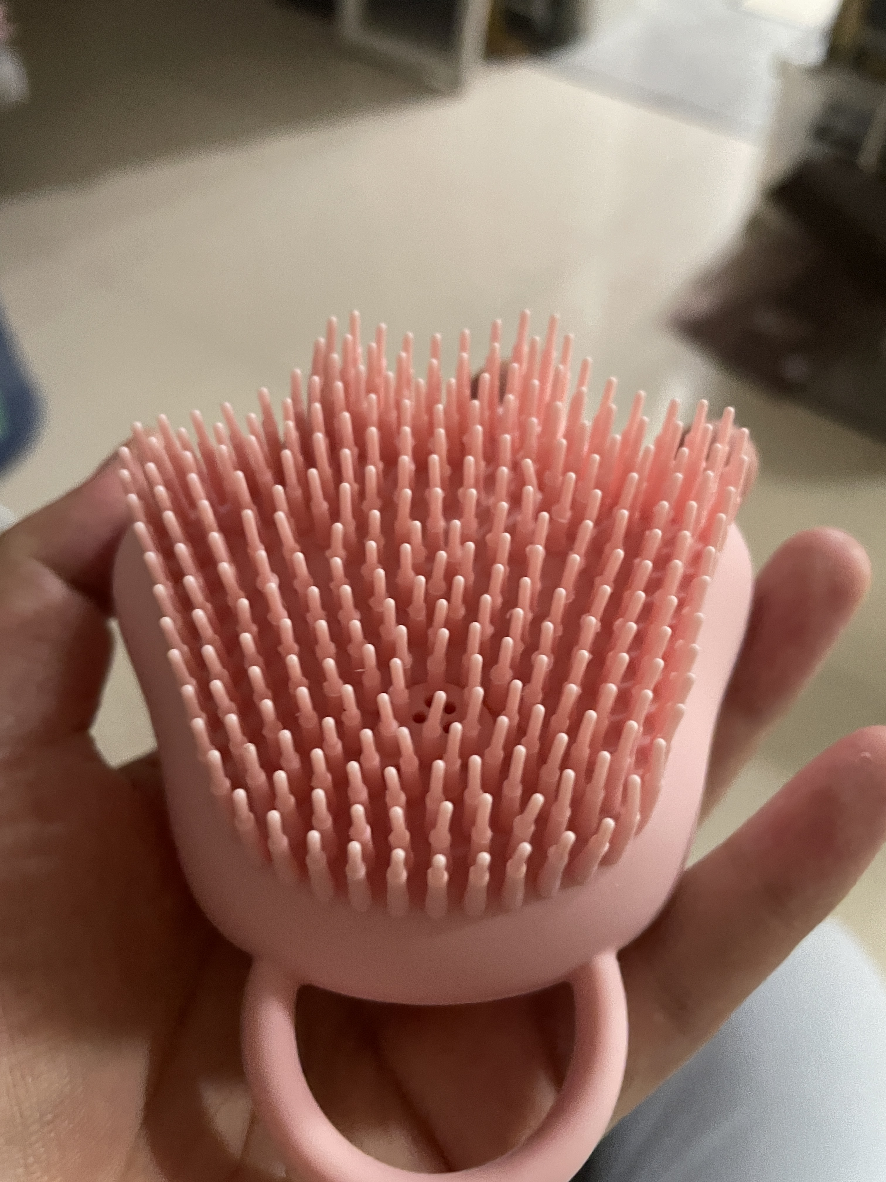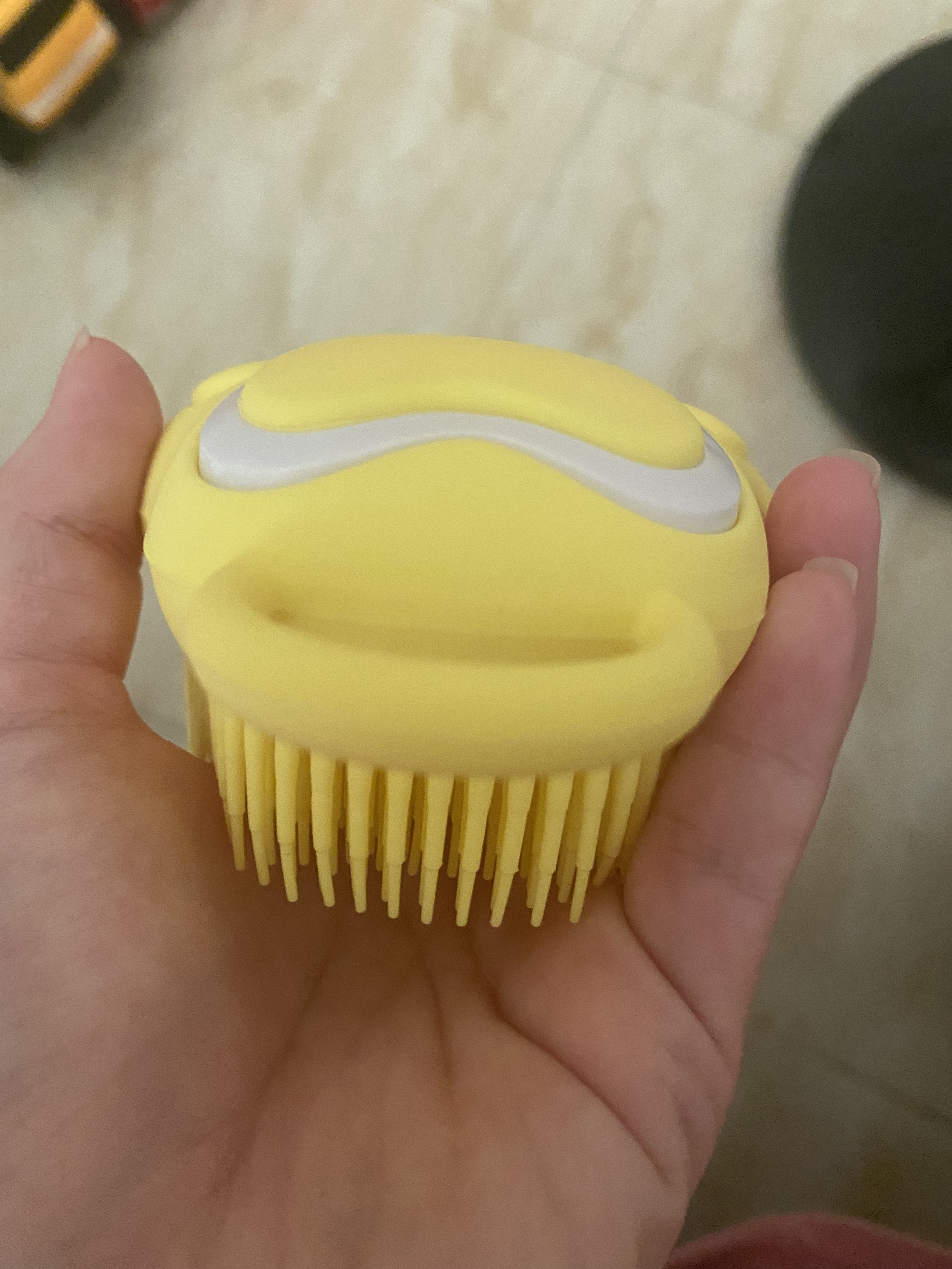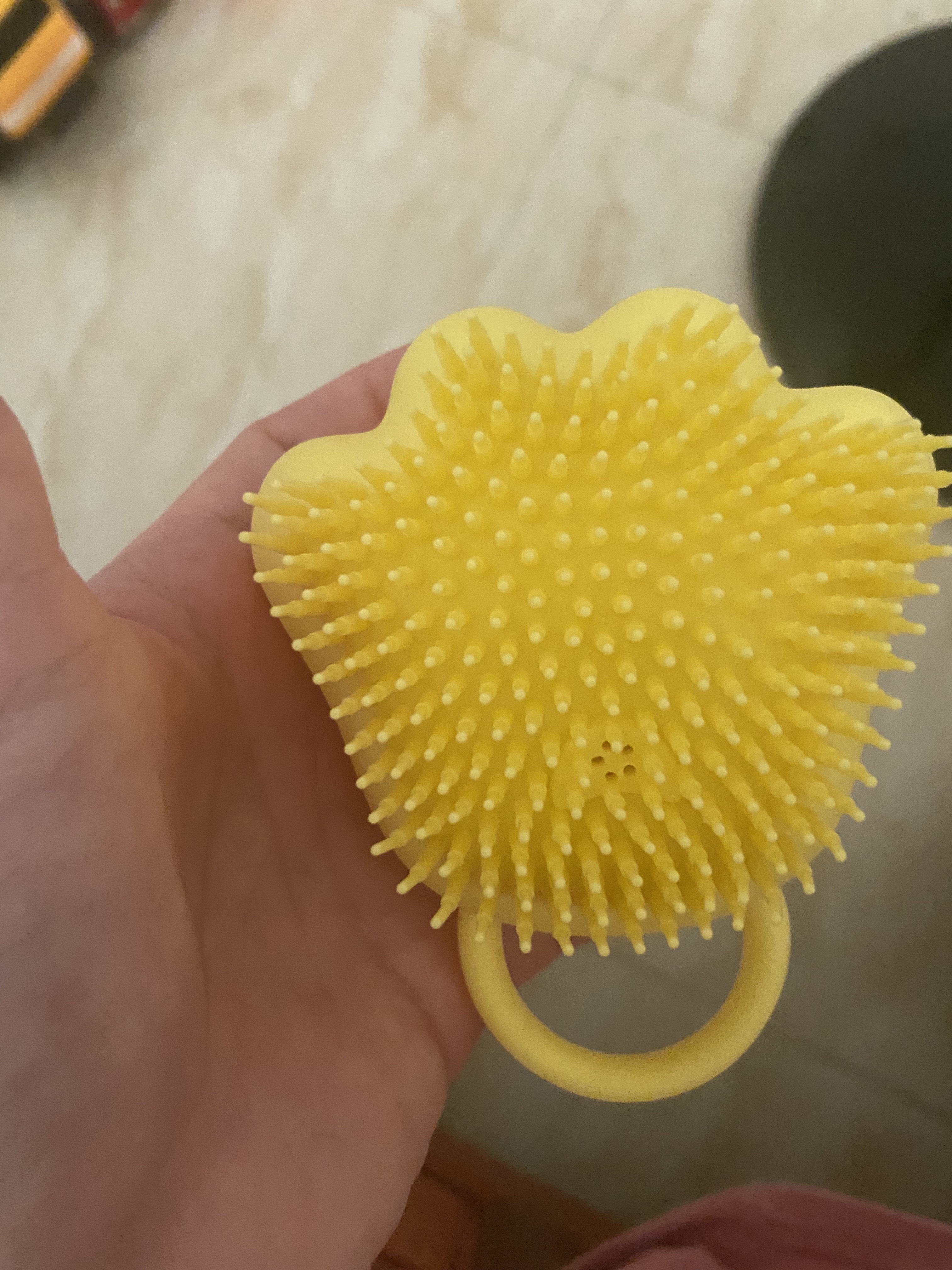 ピンク購入しました🎀 手のひらサイズで可愛い ブラシの部分もほどよいやわらかさ ボディシャンプーを入れられるフタの部分が少し硬いです