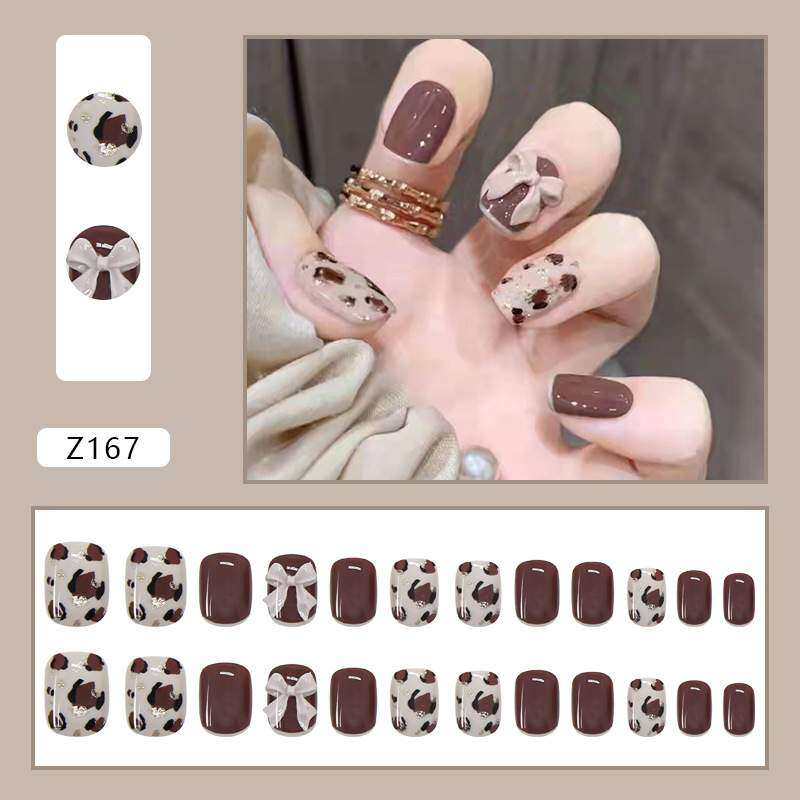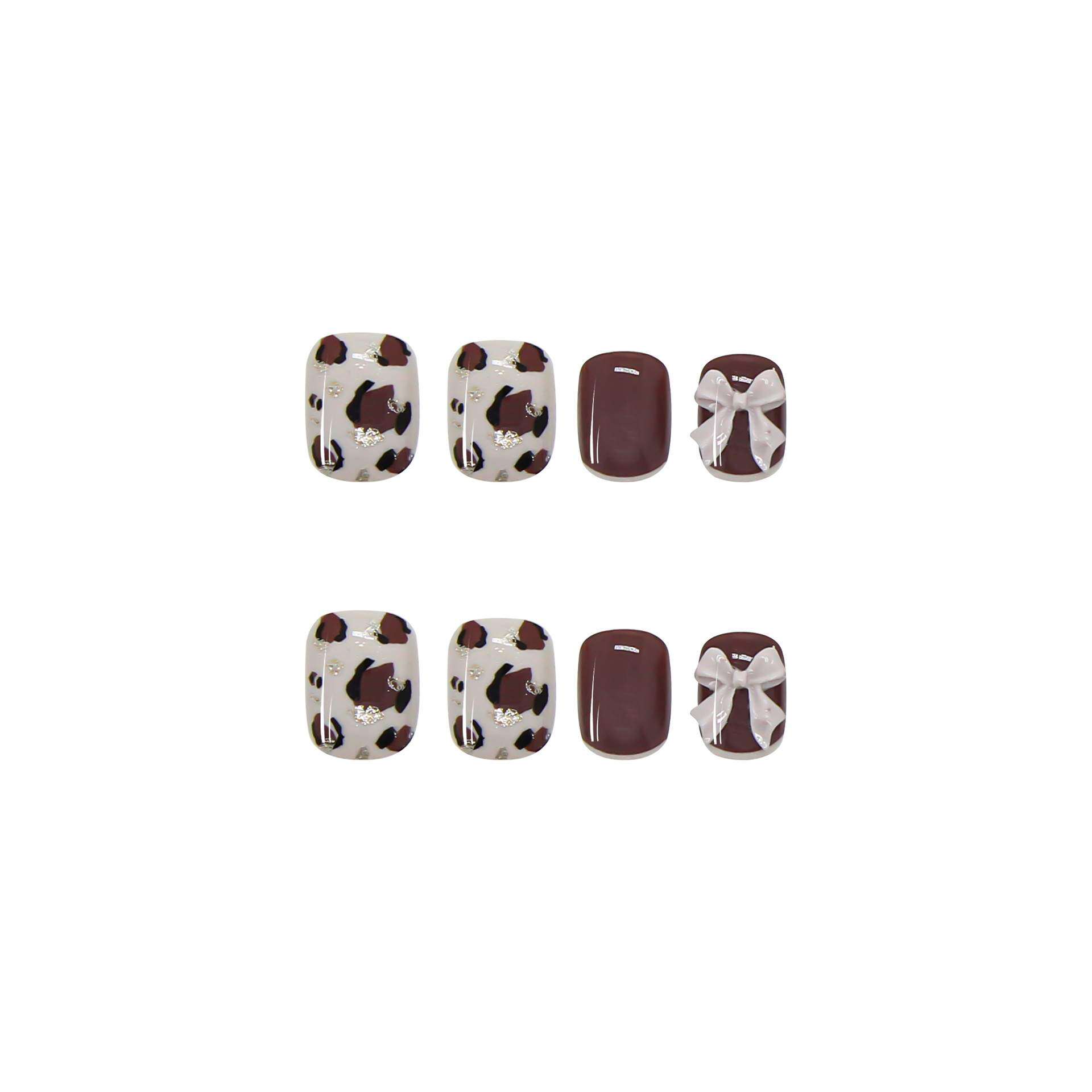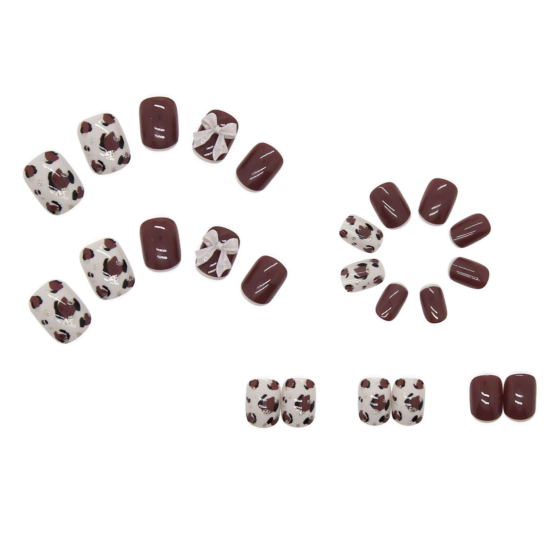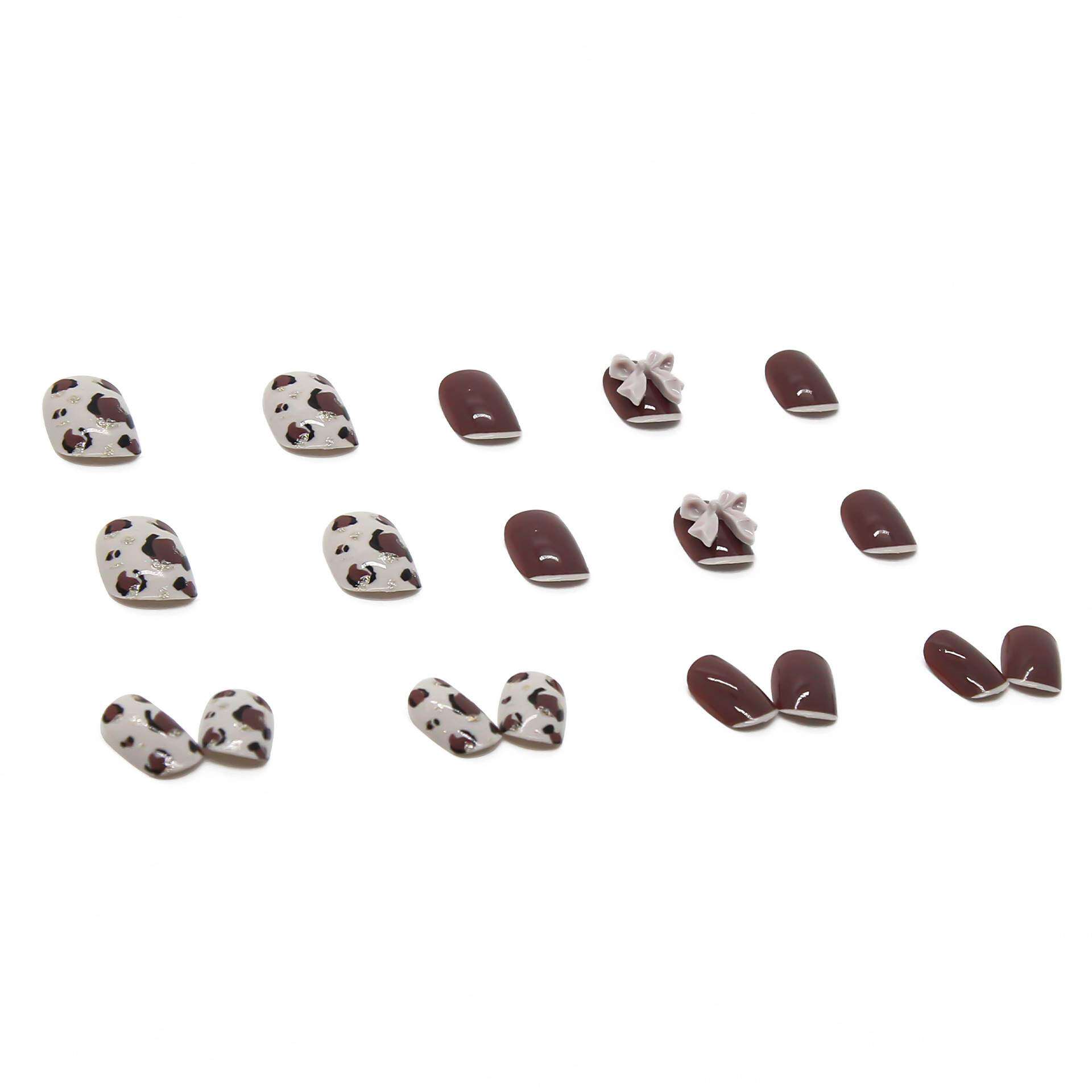 装着用の甲・ネイル・ネイルアート・秋冬・取り外し可能・完成品・ヒョウ柄・ショートタイプ・茶色・フェイクネイル・リボン