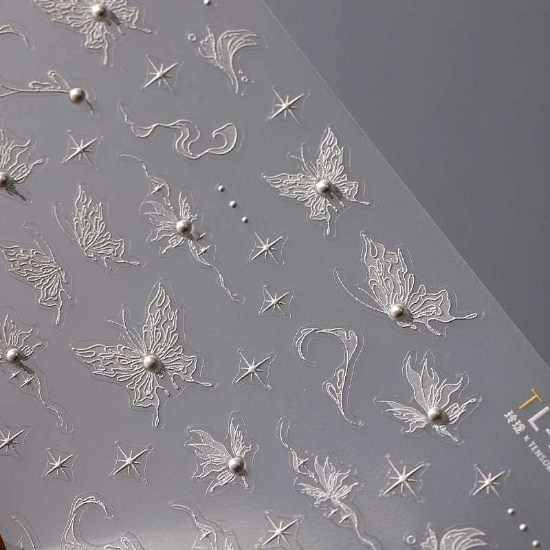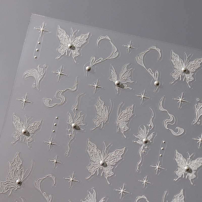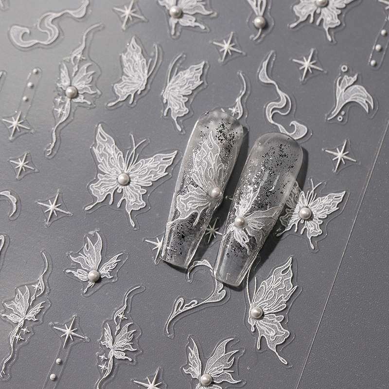 ネイルシール|ホワイト・白い・蝶・真珠付き・ネイルアート・ネイルチップ・立体的・浮き彫り・シール