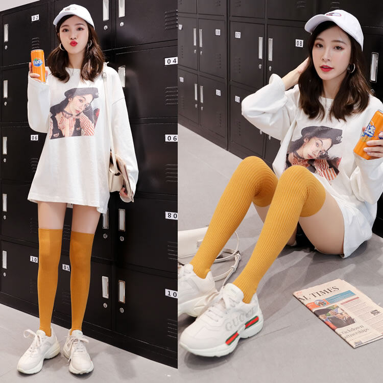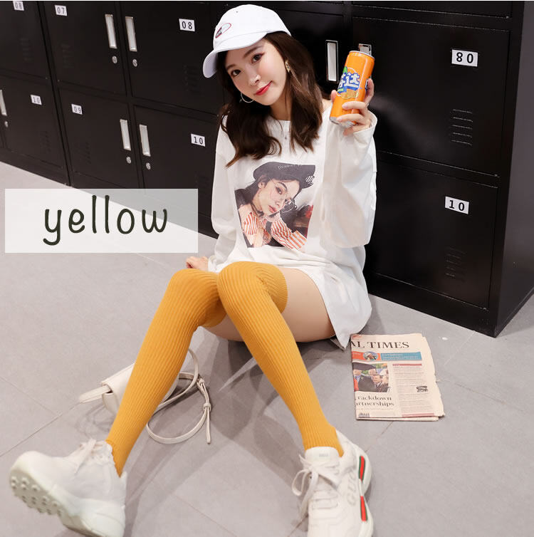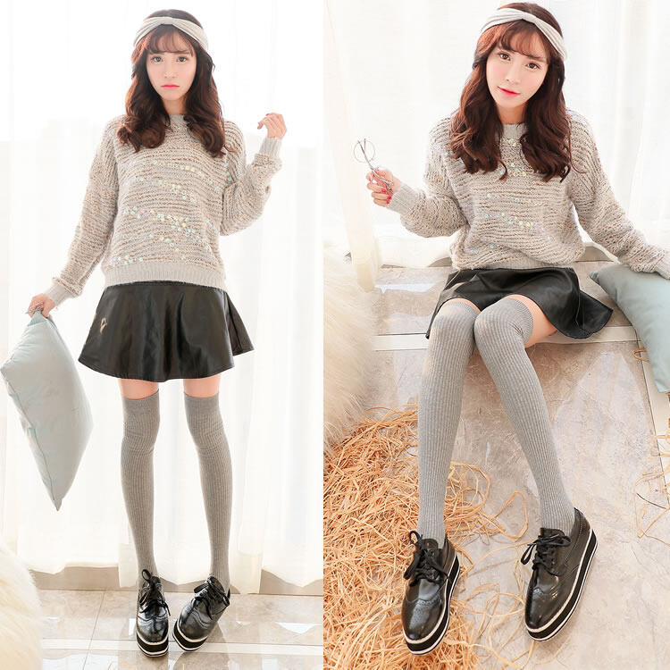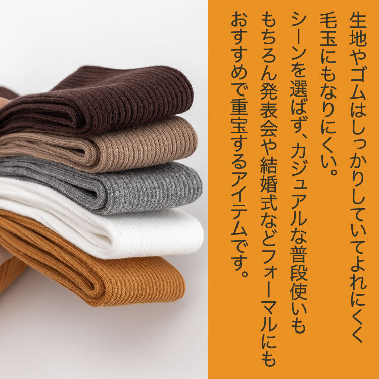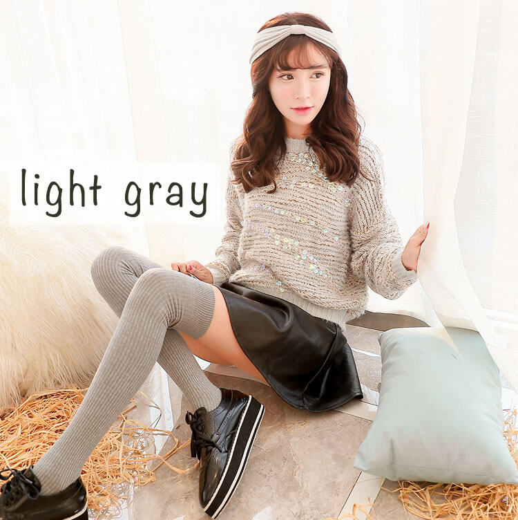 リブ編みが可愛らしい雰囲気を作り出し、足のラインを細く長く見せて美脚効果が抜群!膝上丈でスカートに最適です。
