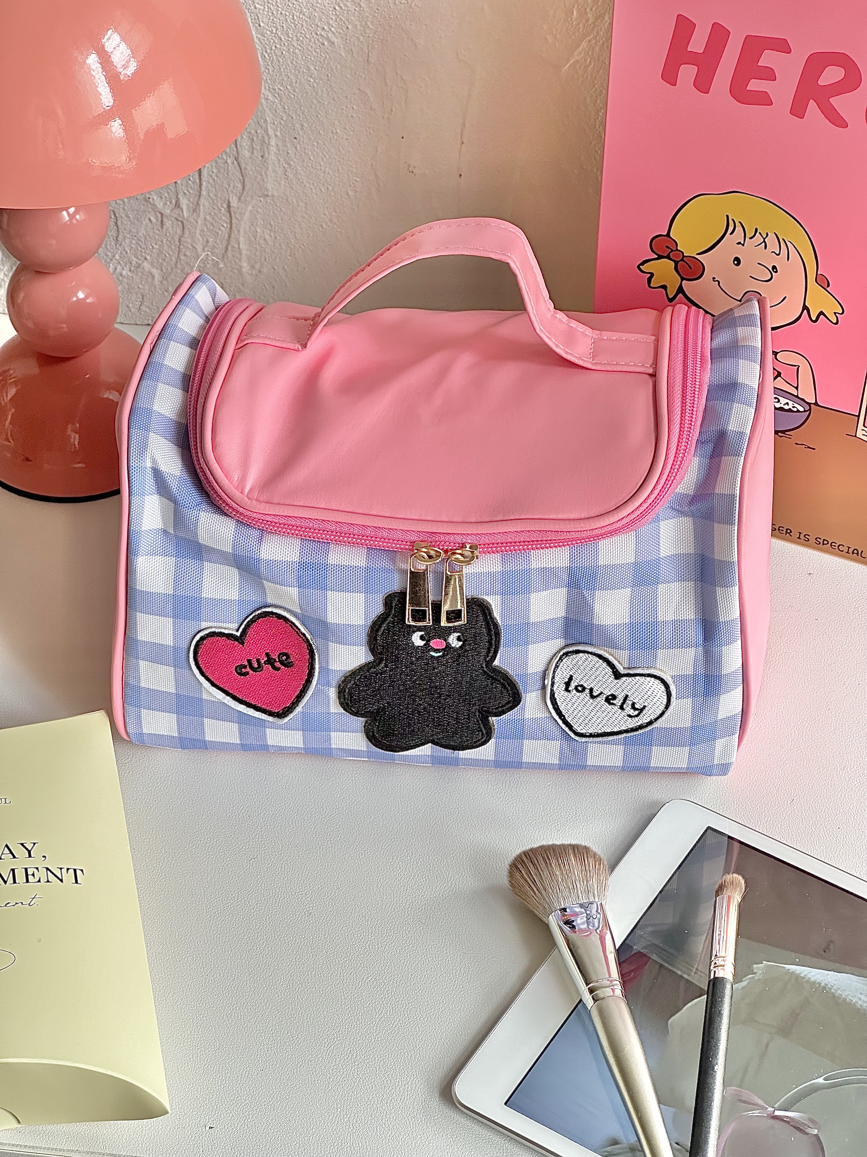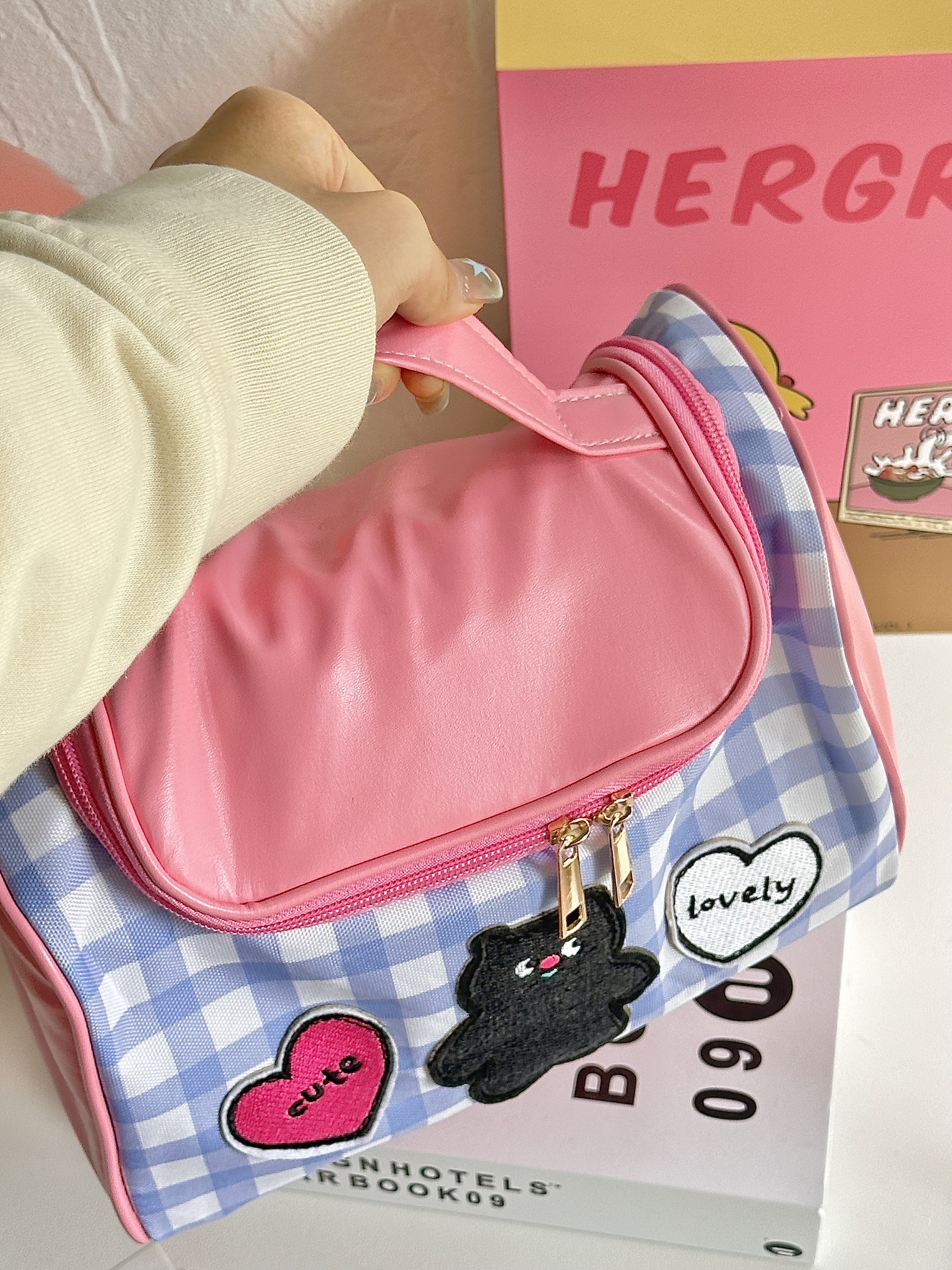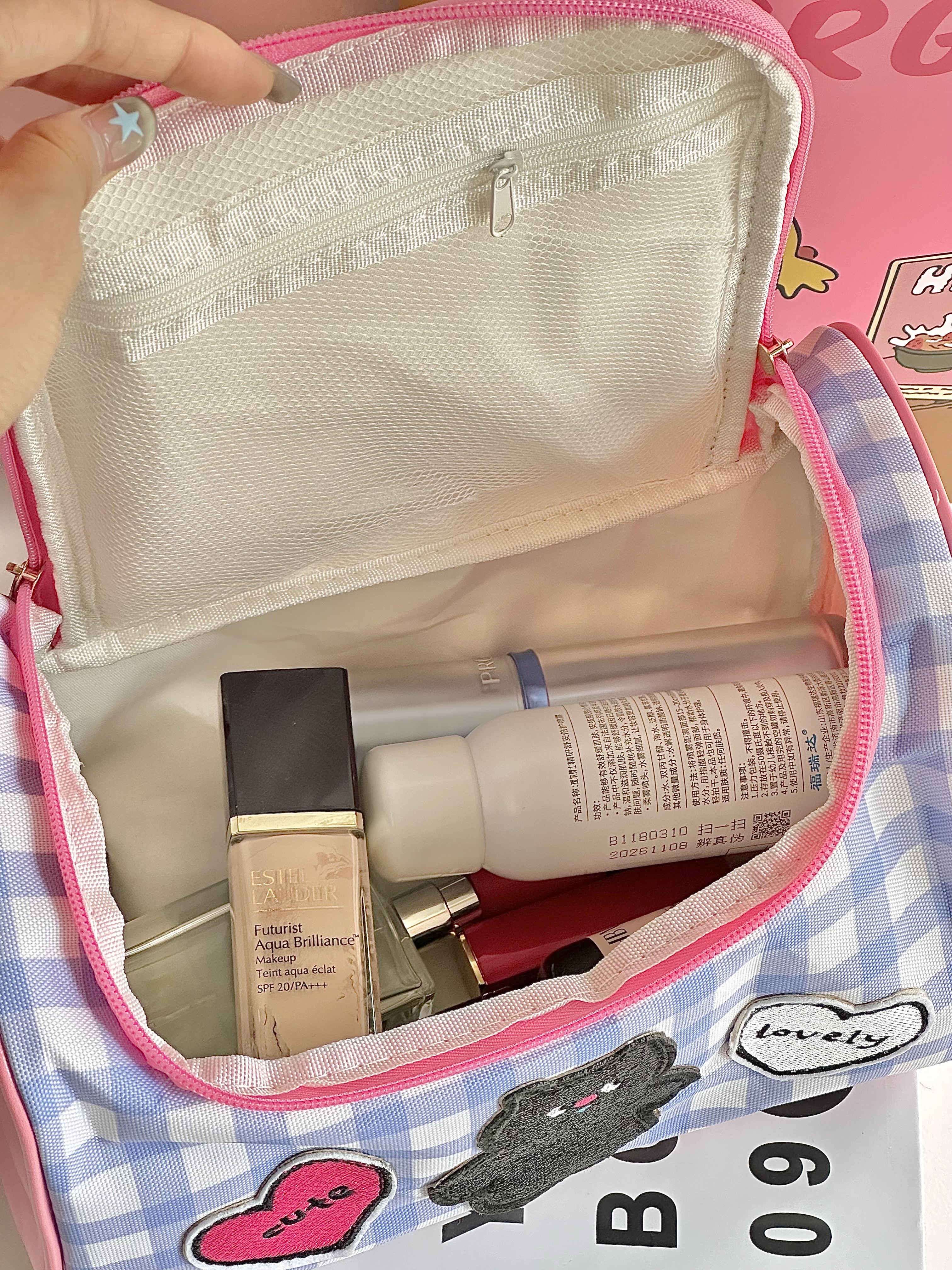 この化粧バッグはとても可愛いですね。上に刺繍された小さなクマとハート💗が立体的で、質感もあります。容量もたっぷりあり、とても大きくてたくさん入ります👍