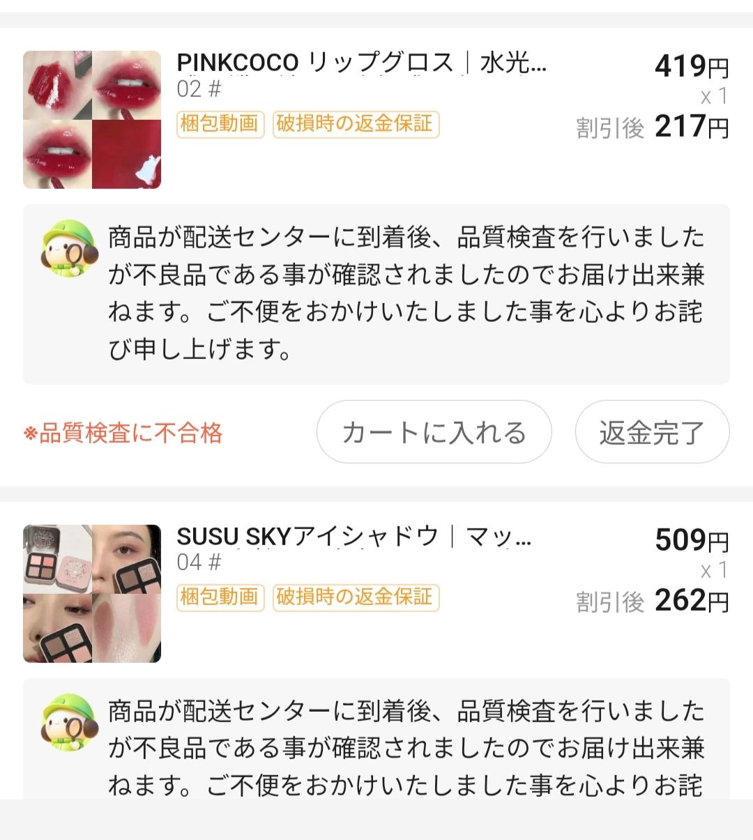 不良品なのでお届けできなない!と言う商品や中身がスカスカのリップが2個届いたり写真と明らかに違う色のリップが何回か届いたり異物が入ったリップが届いたりと何かと色々あって高品質と言う言葉は信用しても大丈夫かしらって不安になってしまったり(TдT) このリップに関してはデザイン可愛いです!涼し気でとても素敵です!