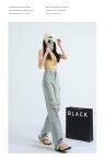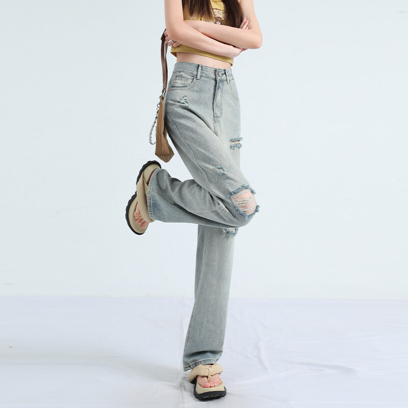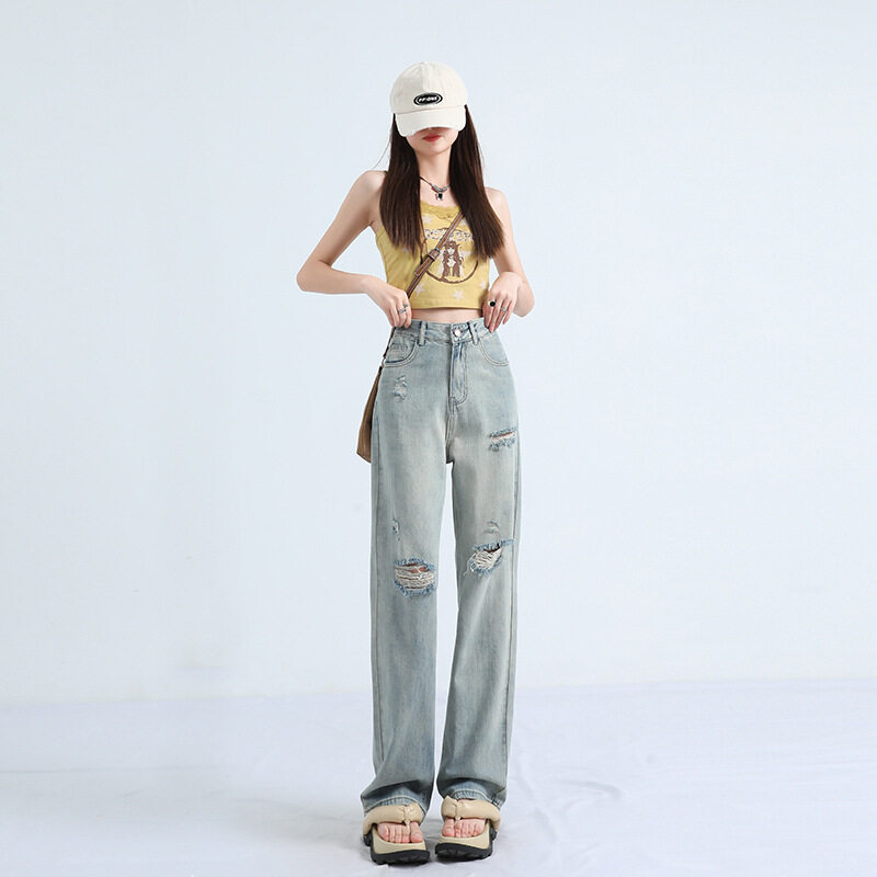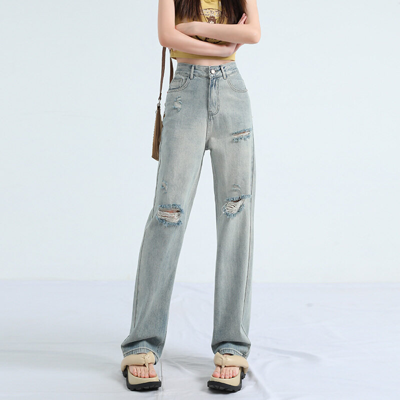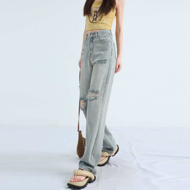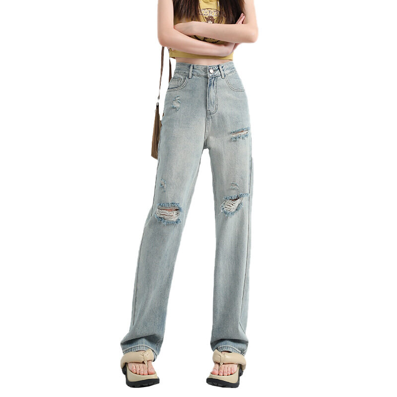 吉ジーンズ|ダメージ加工・ハイウエスト・ワイドレッグ・ゆったり・春夏・スリム効果・小柄向け・ストレート