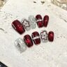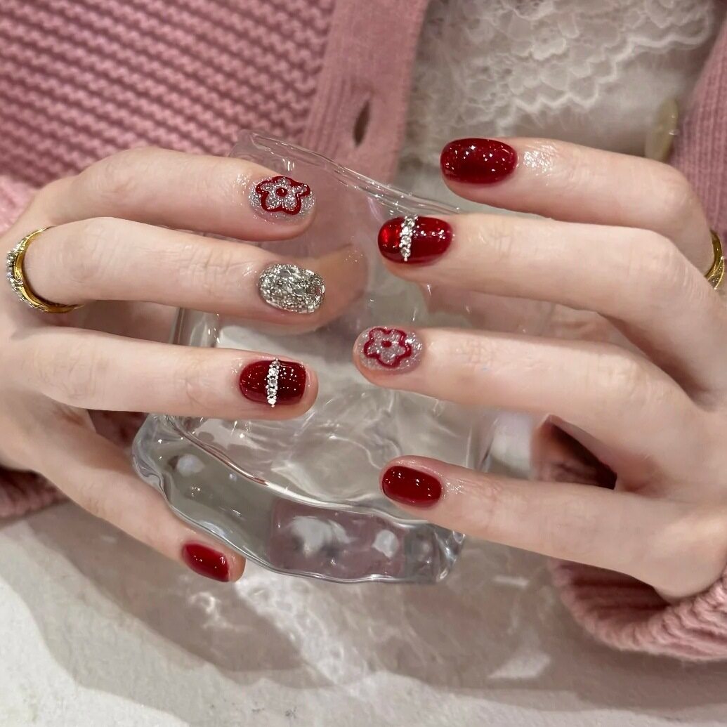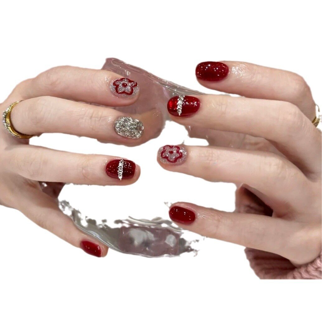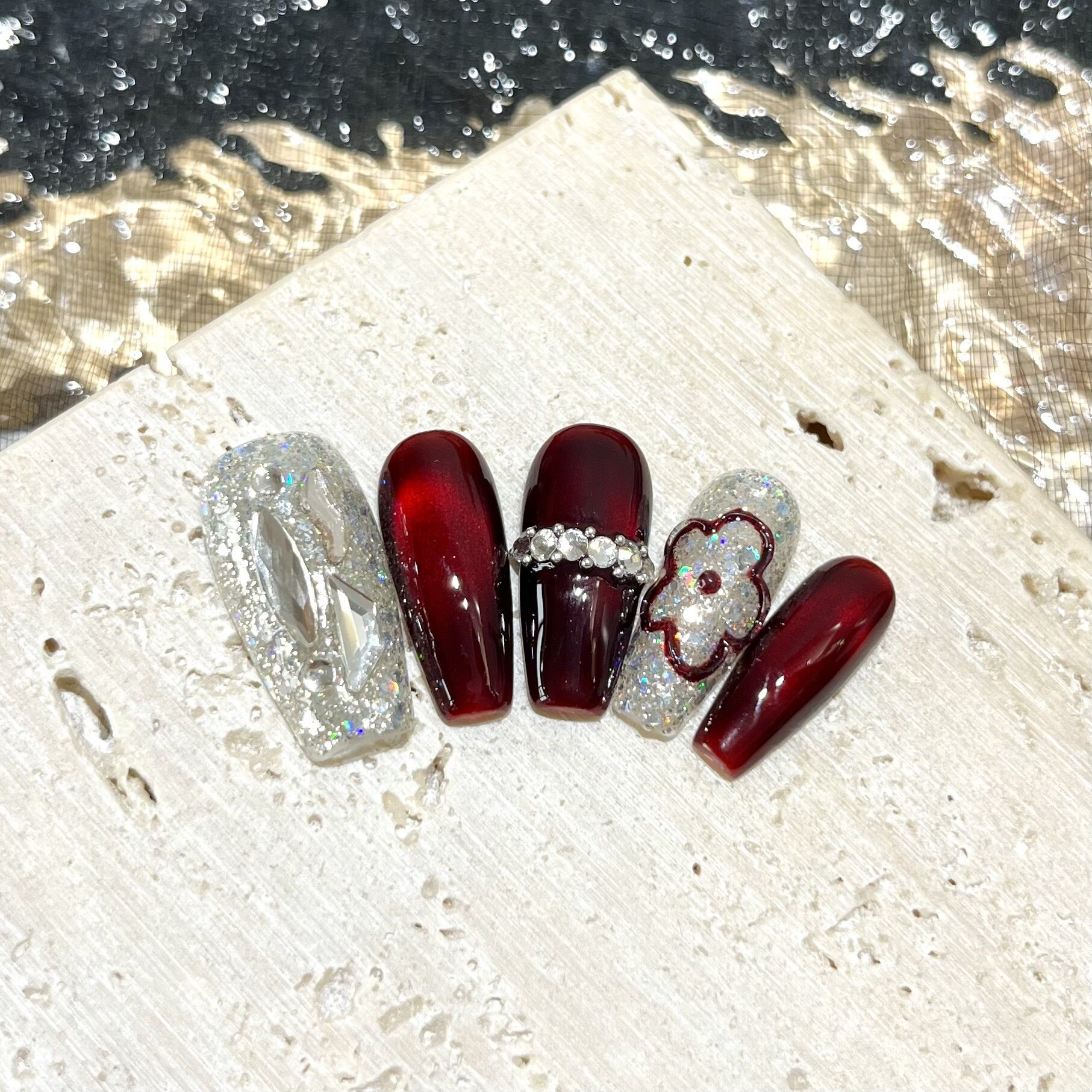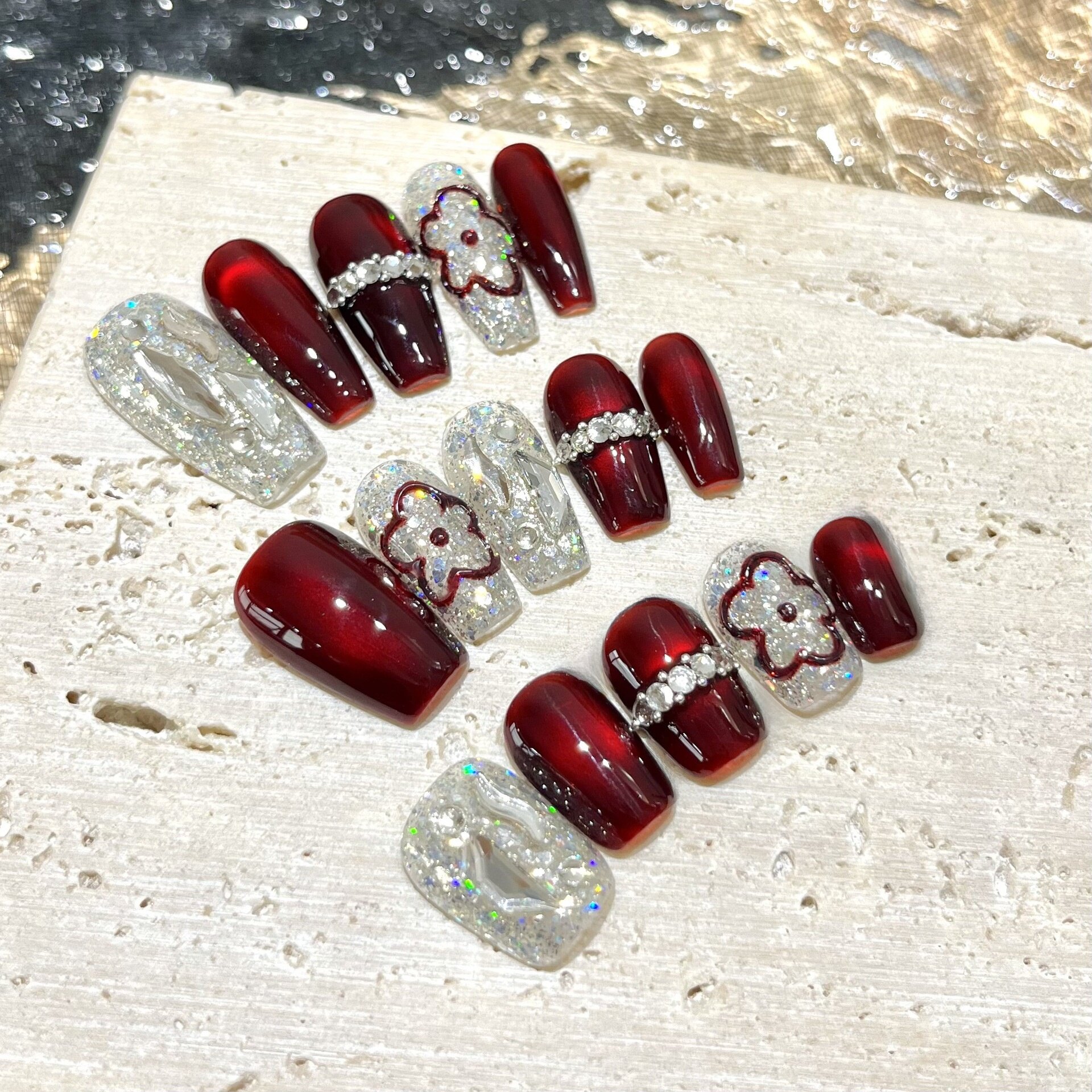 【10枚】ネイルチップ|手作り・赤・キャッツアイ・短い・高級感・華やか・肌映え・おしゃれ・成人式・結婚式・パーティー