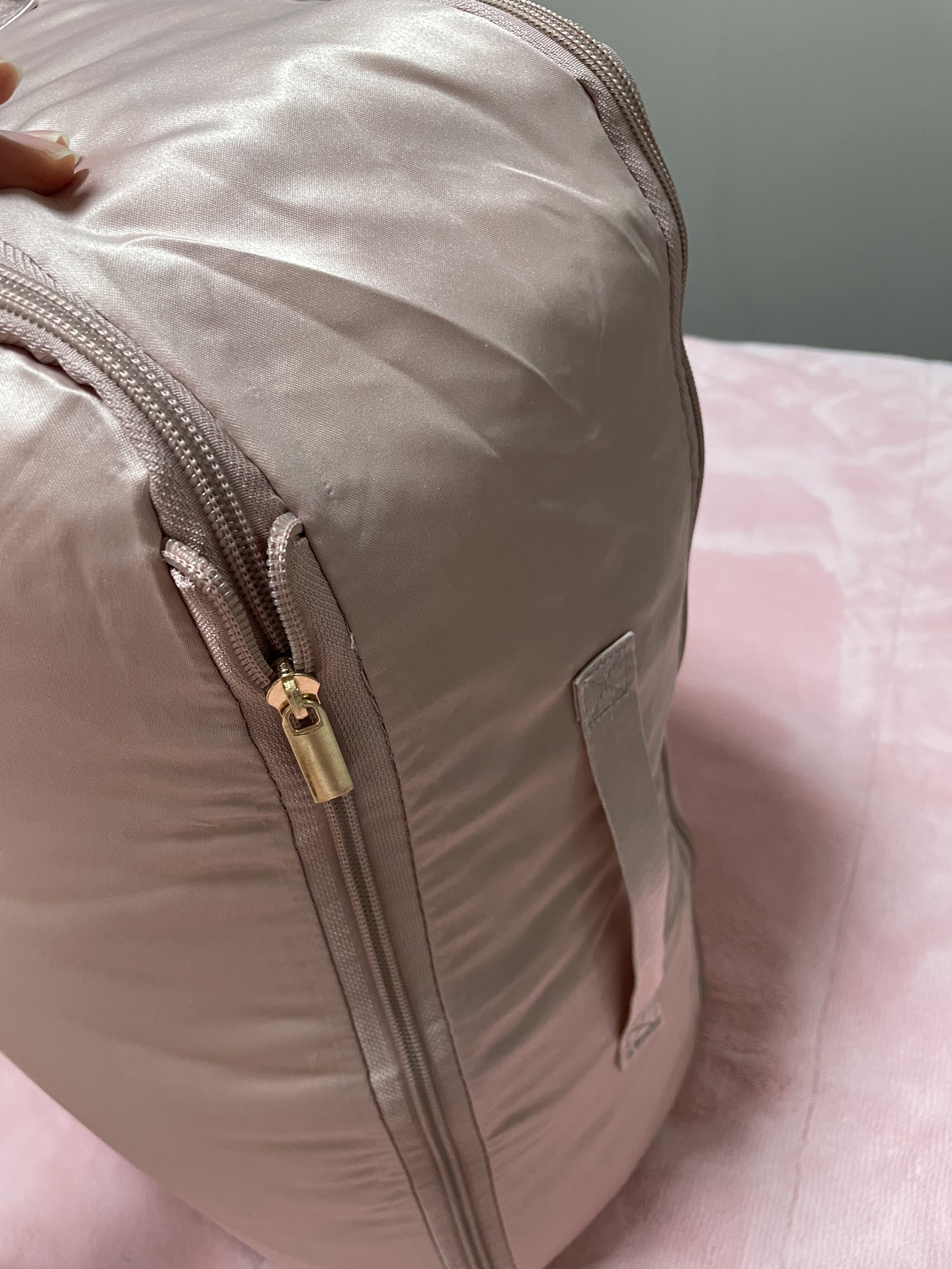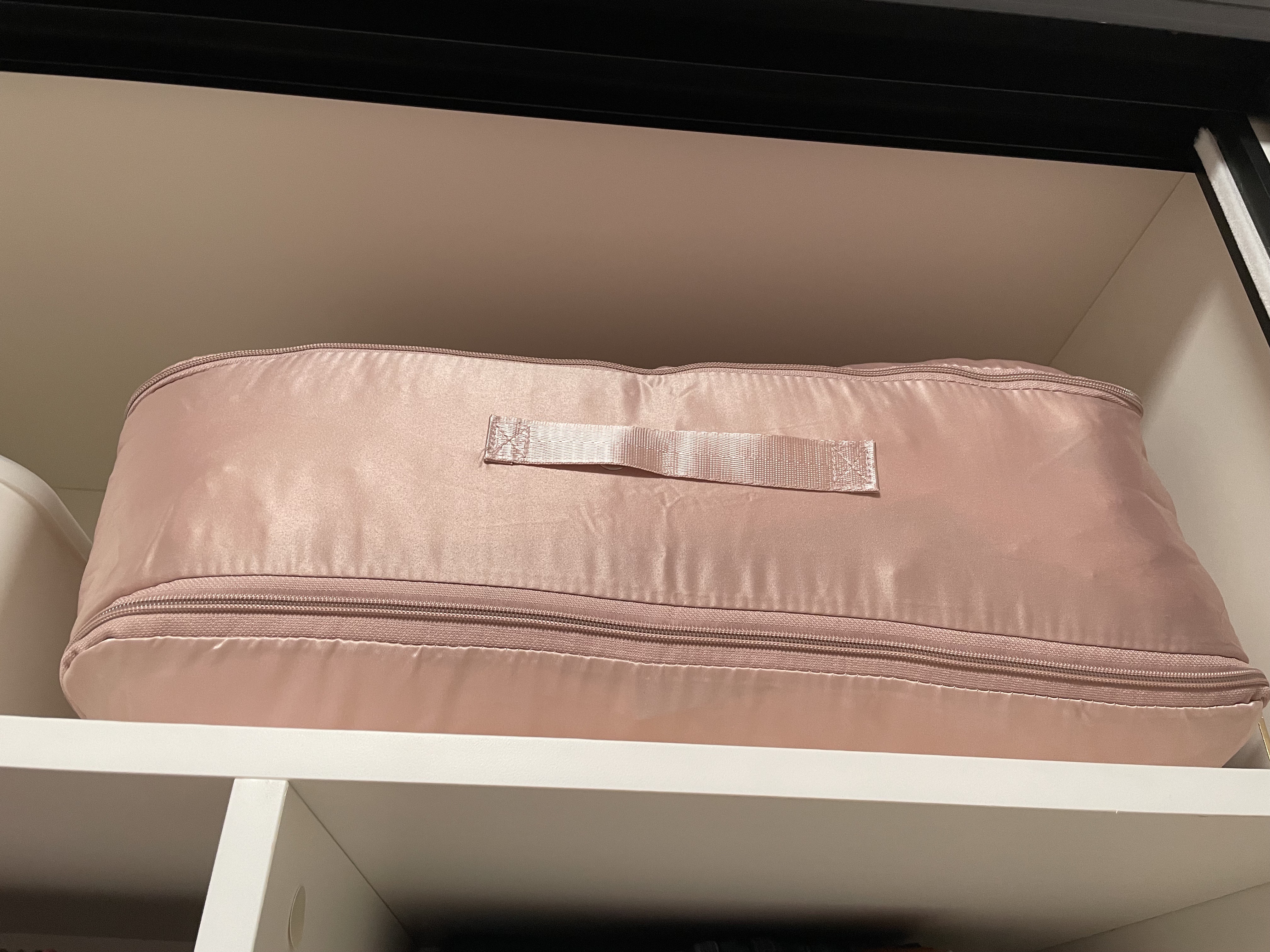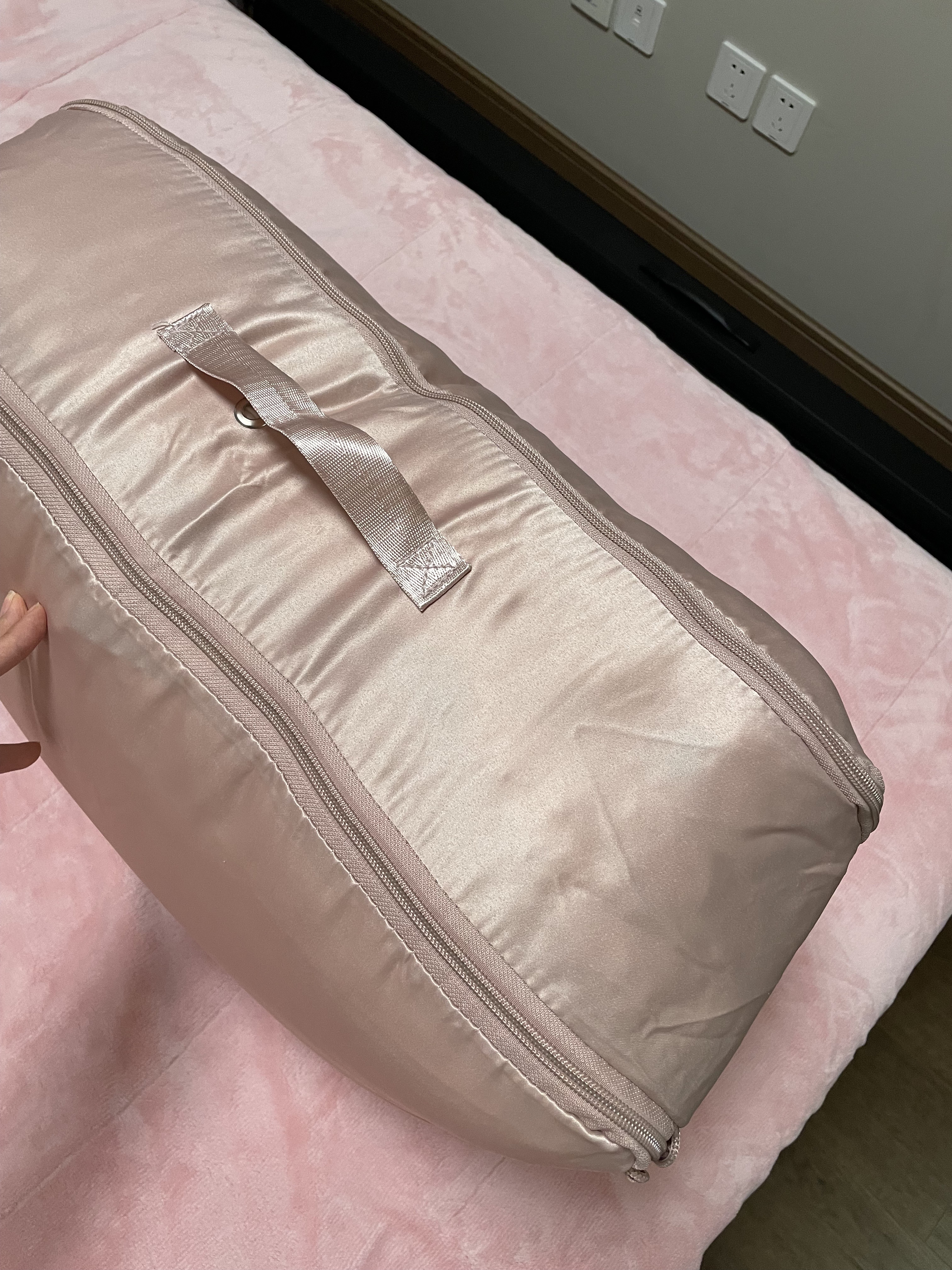 友達のおすすめで購入しました。本当に便利なシルクカバーの布団収納バッグです。ダブルジッパーで、極厚の布団1枚+シルクの布団2枚を収納できます。非常に収納力があり、以前の圧縮袋よりもずっと美しいです。キャビネットに置くのにちょうど良く、汚れた粉の色も魅力的で、ミルキーです。