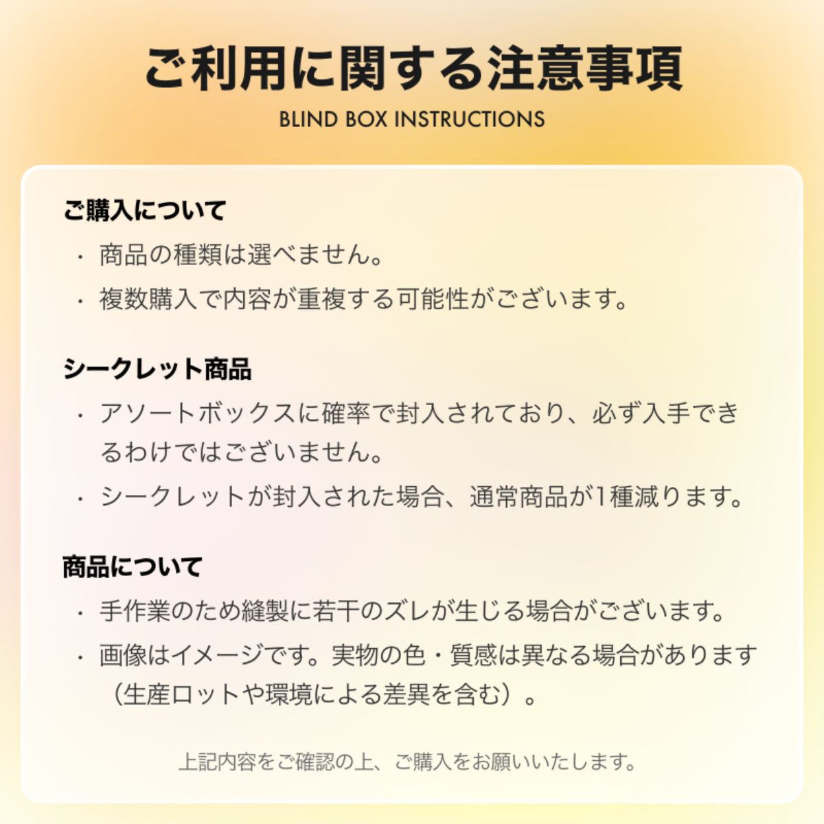 ブラインドボックスをご購入いただく際は、下記の注意事項をご確認の上、お楽しみください。
