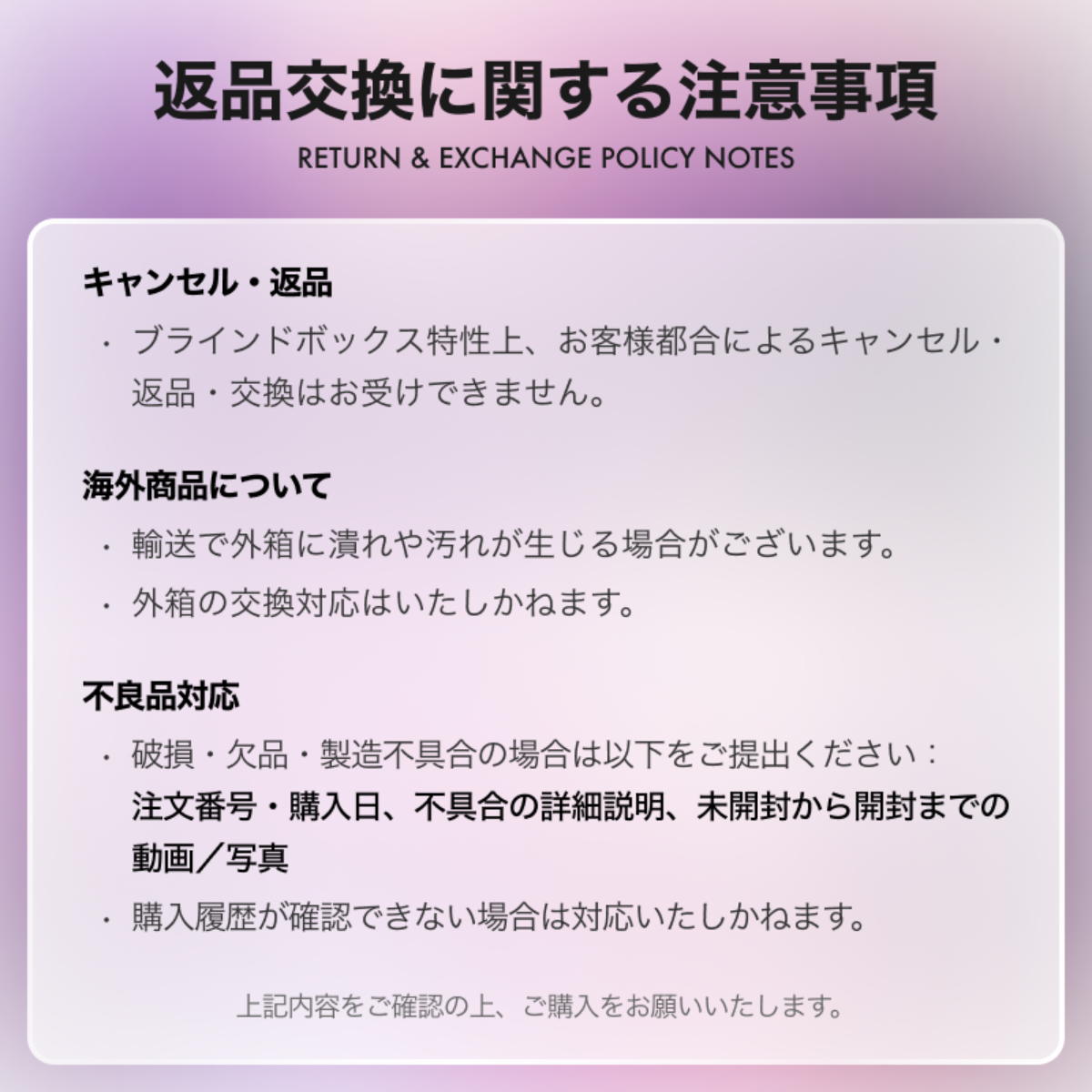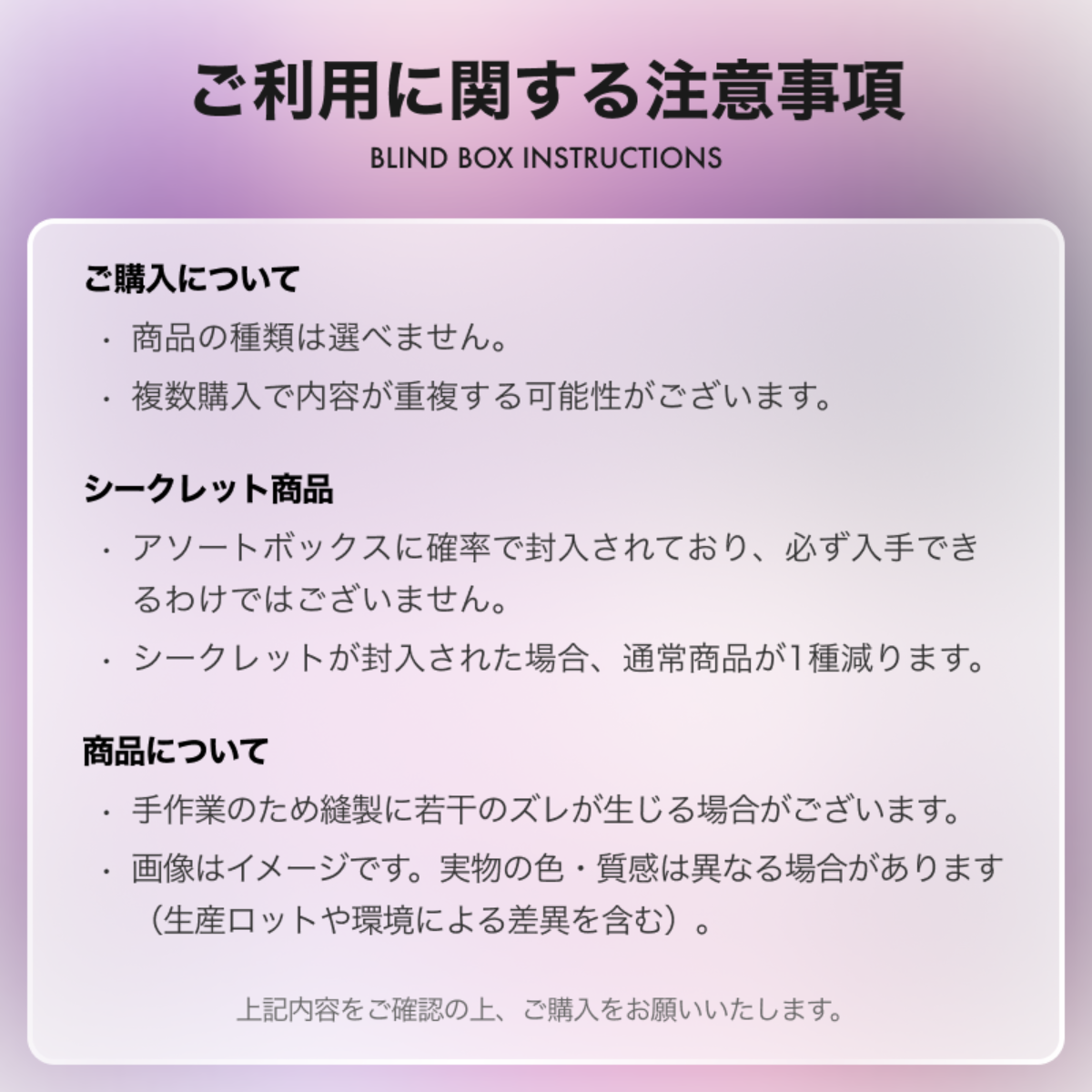 ブラインドボックスをご購入いただく際は、下記の注意事項をご確認の上、お楽しみください。