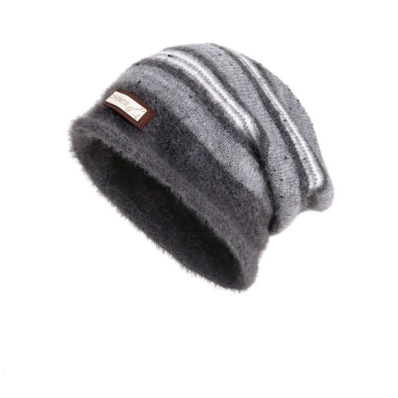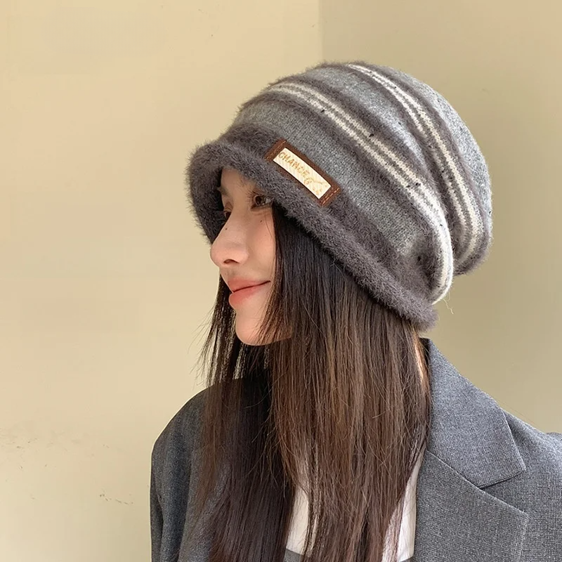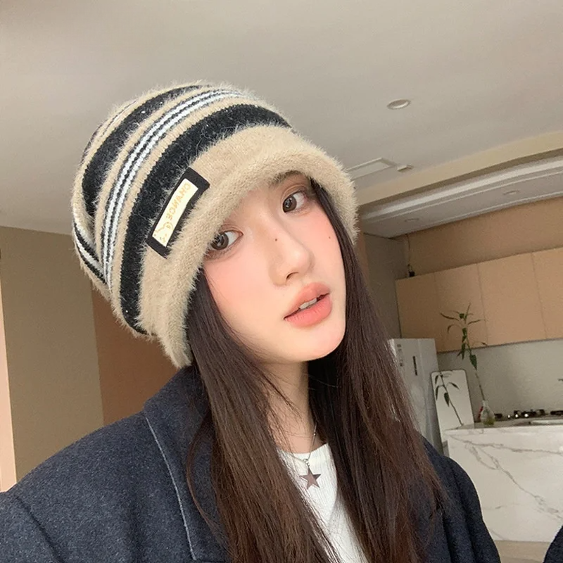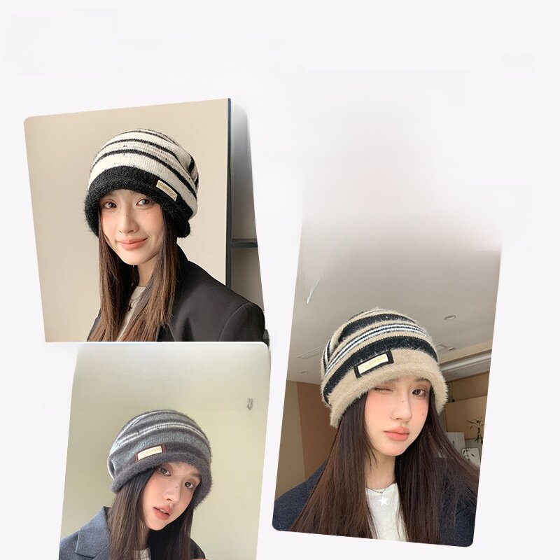 ニット帽|ストライプ柄・防寒・耳当て付き・小顔効果・ボリューム感・おしゃれ