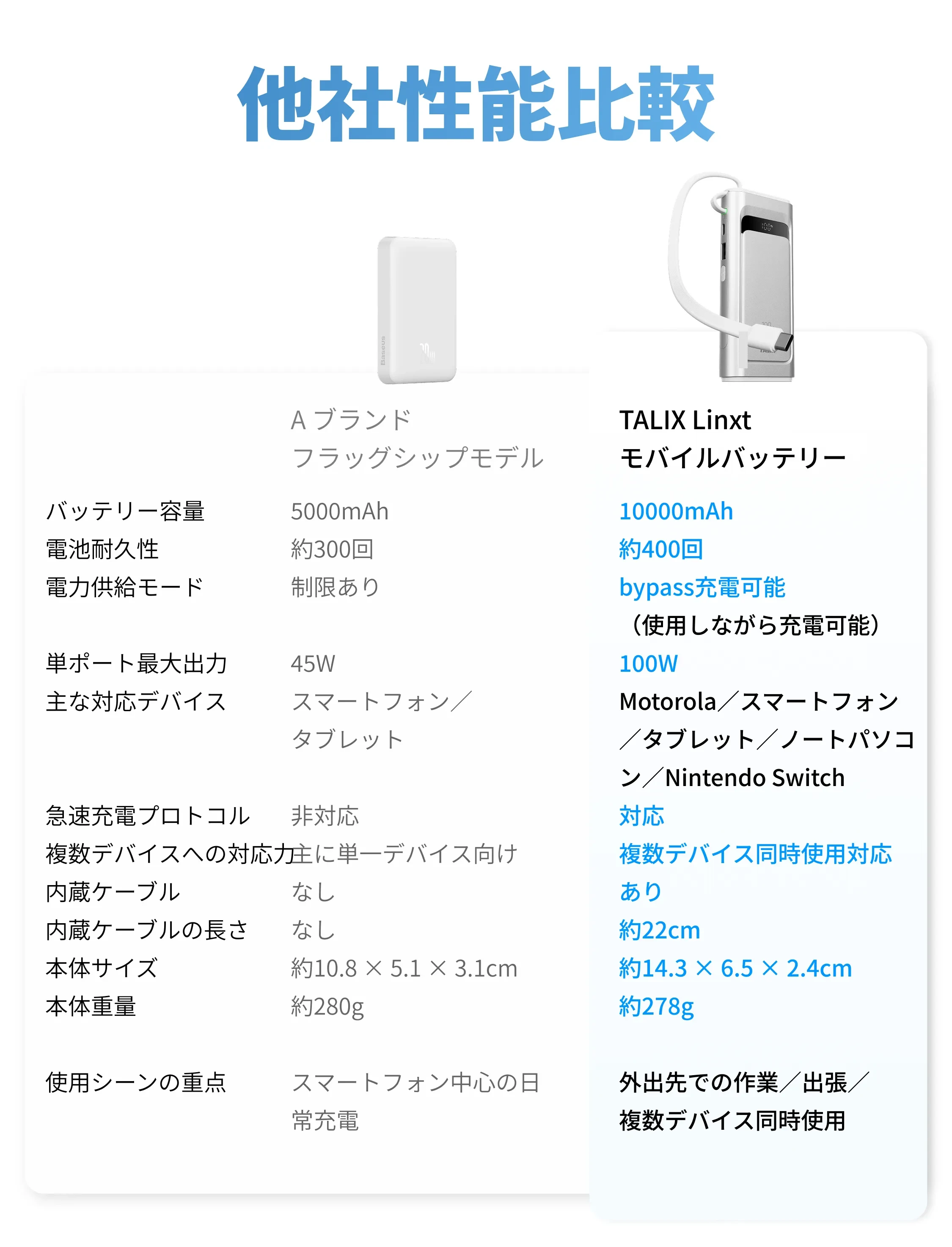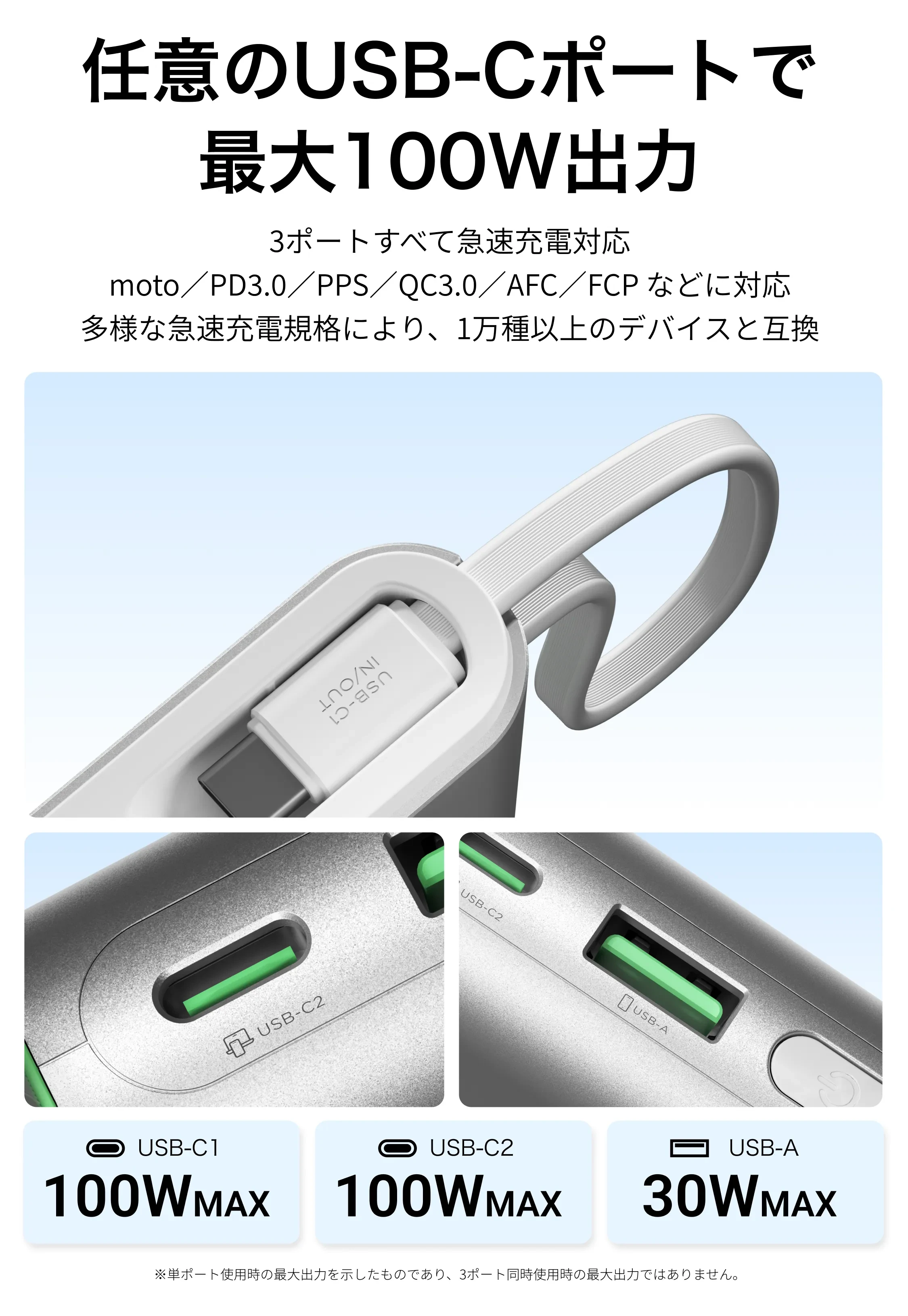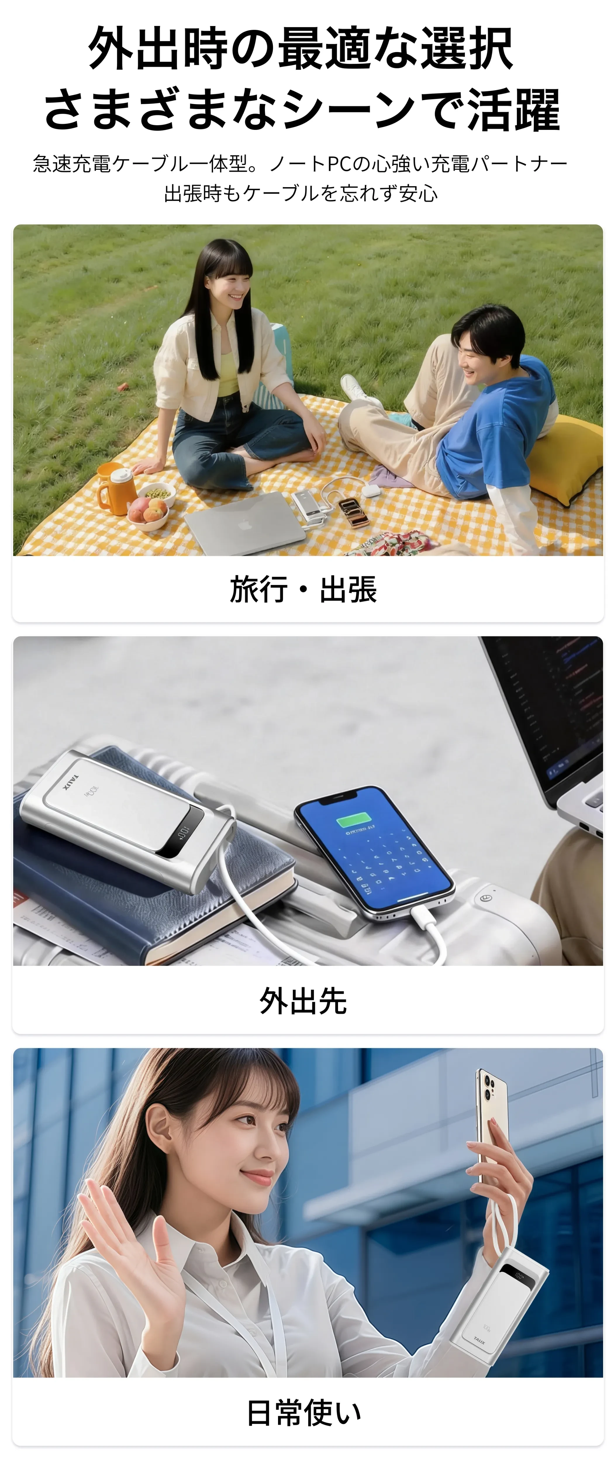 外出先でノートパソコンのバッテリーが切れそうになり助けられました。充電速度も安定していてストレスがありません。内蔵ケーブルがin/out対応なので、別途ケーブルを持ち歩かなくて済みます。
