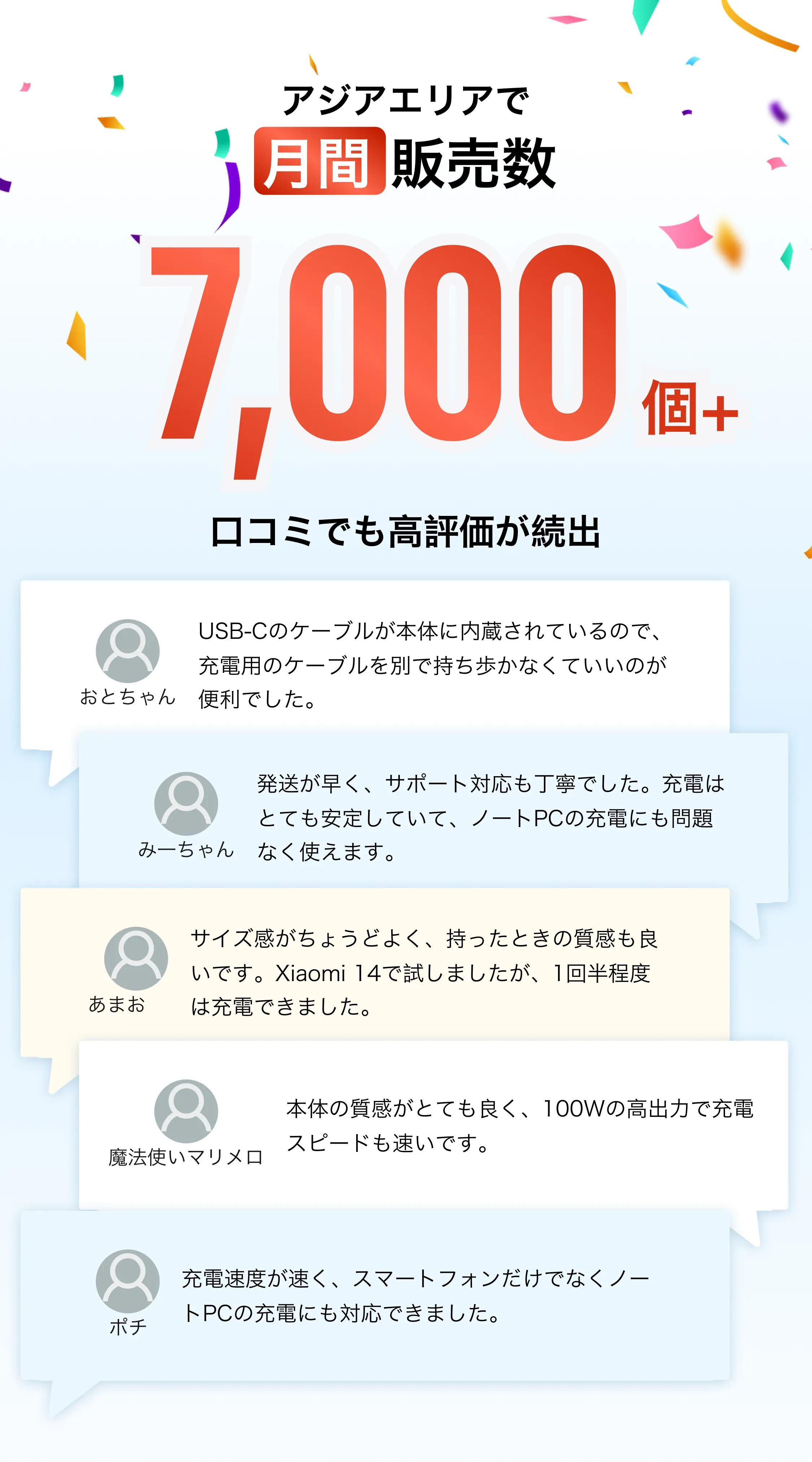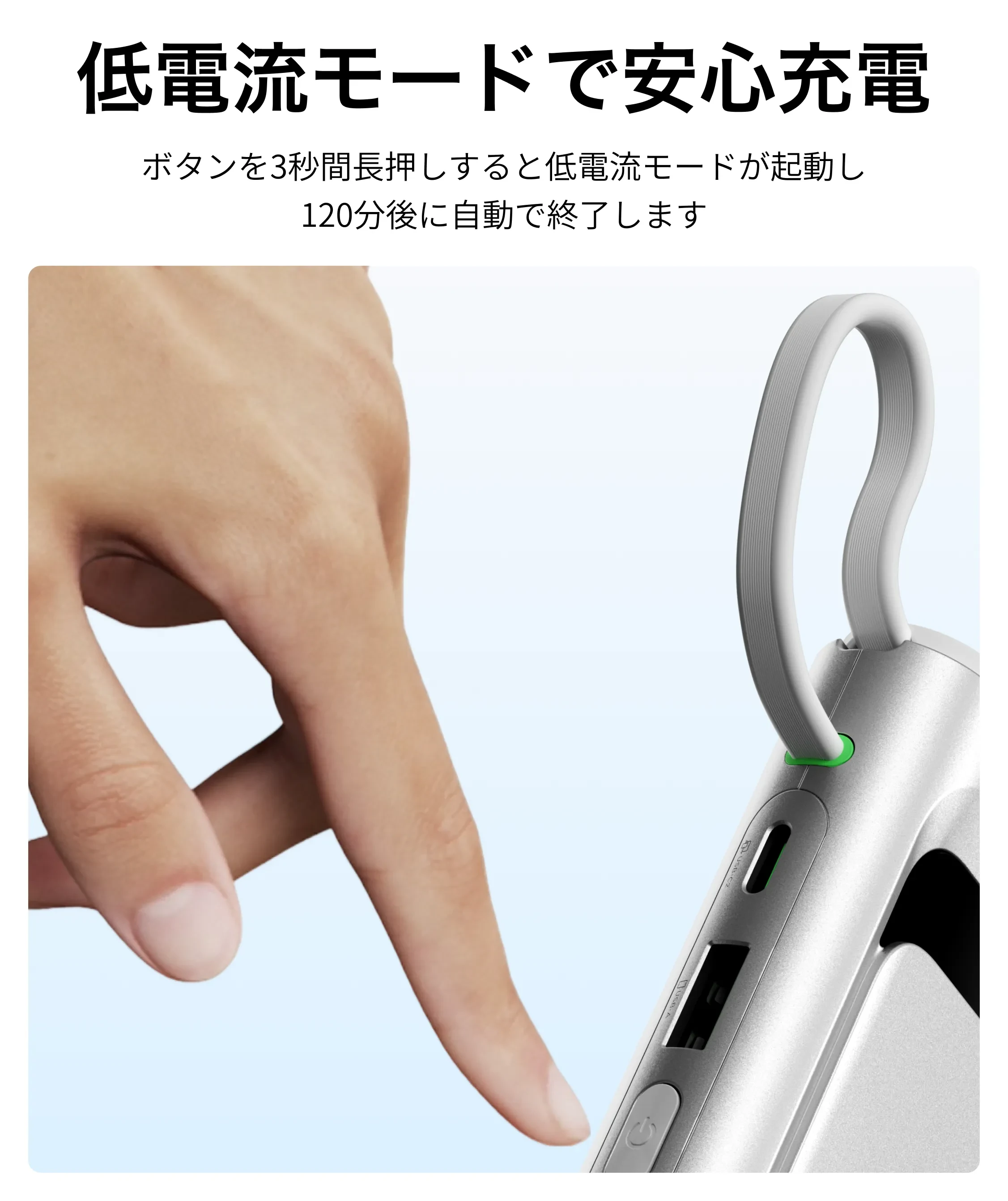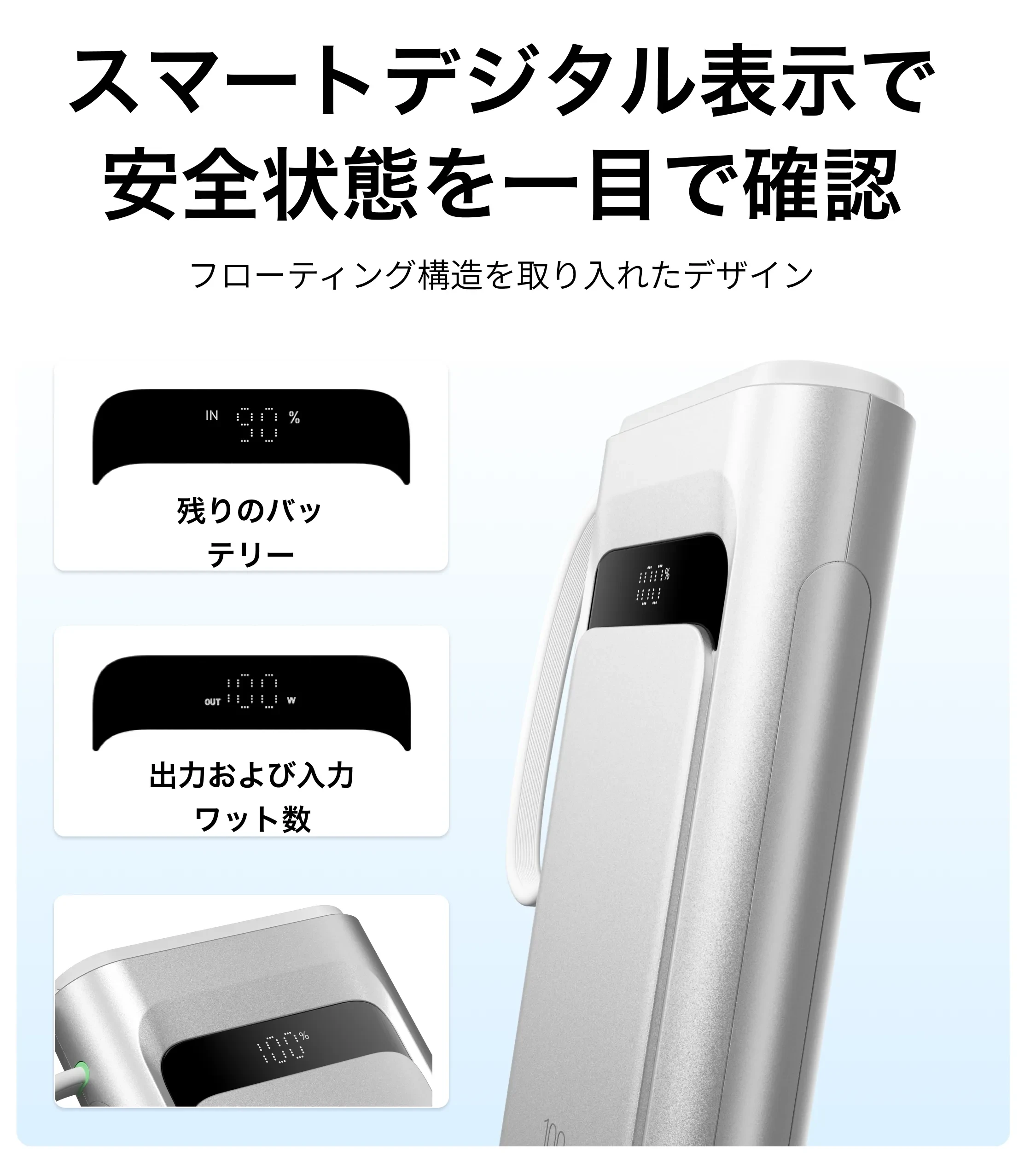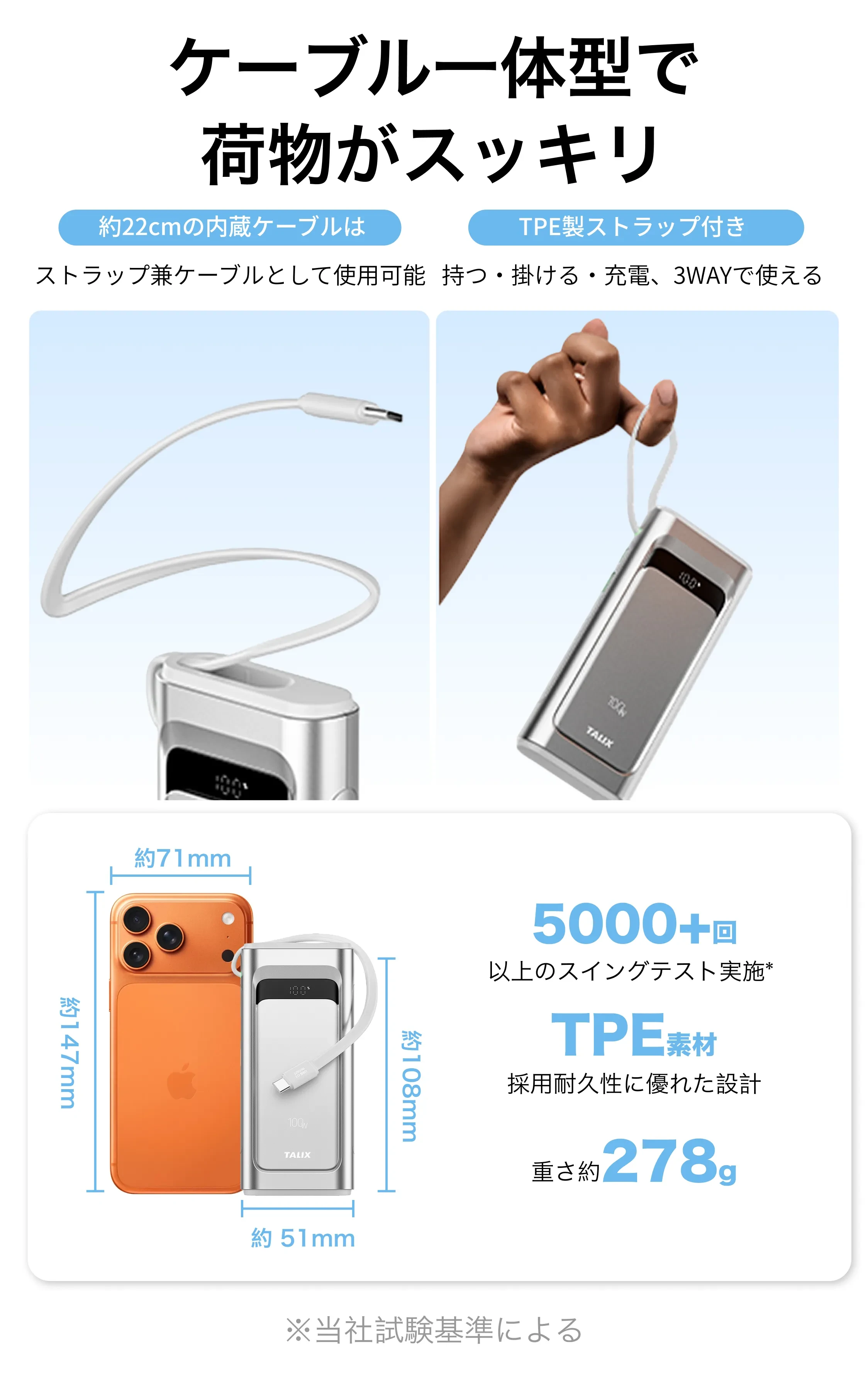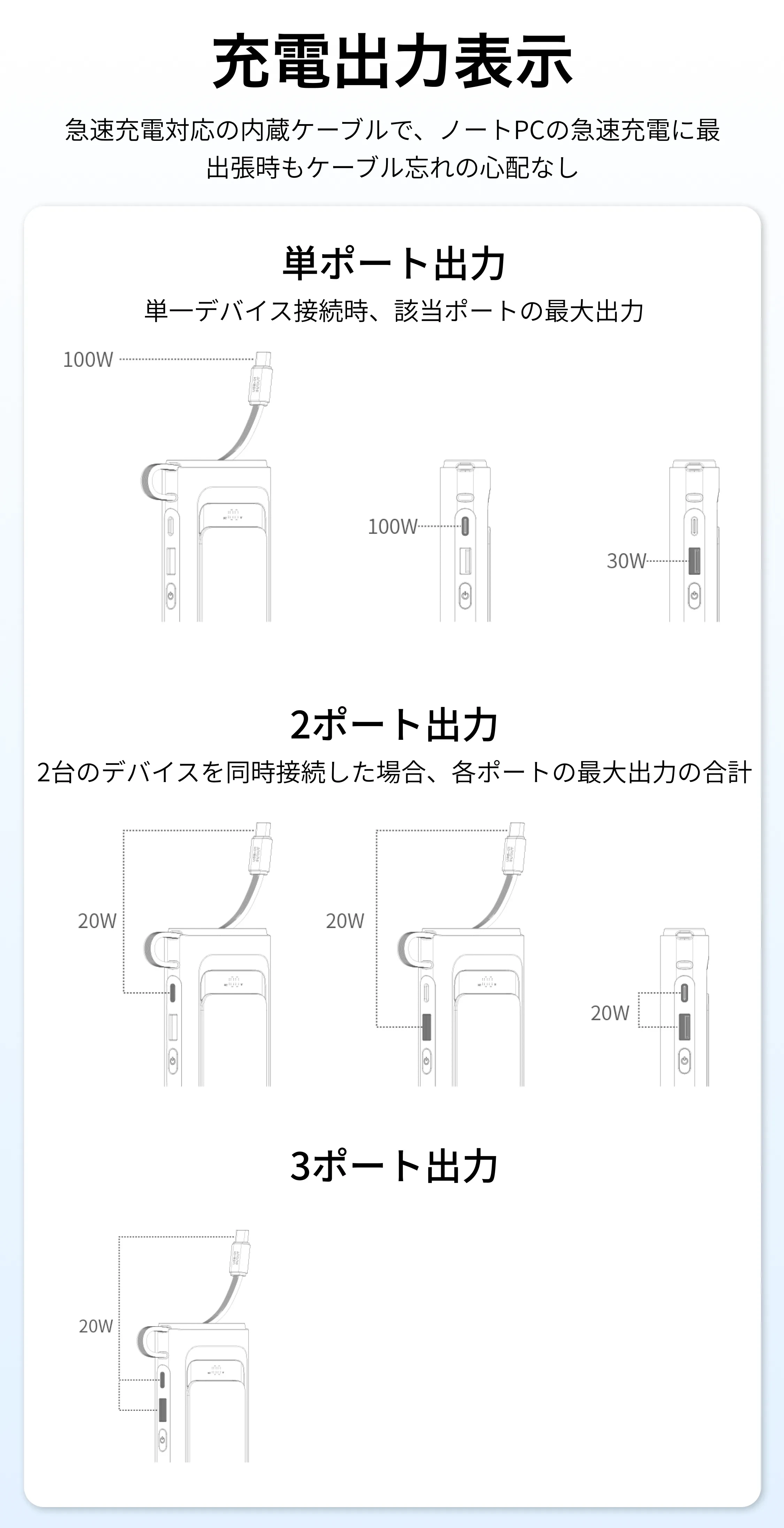 スマホの充電がとても速く、ノートPCの充電も問題なくできました。いざという時にPCまで対応できるのは安心感があります。ケーブル内蔵で、入出力どちらにも使えるのが便利です。